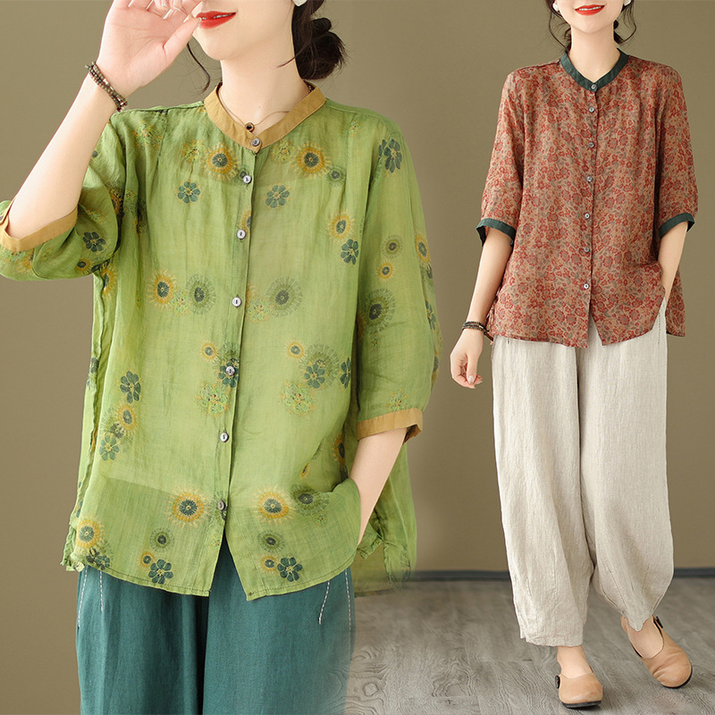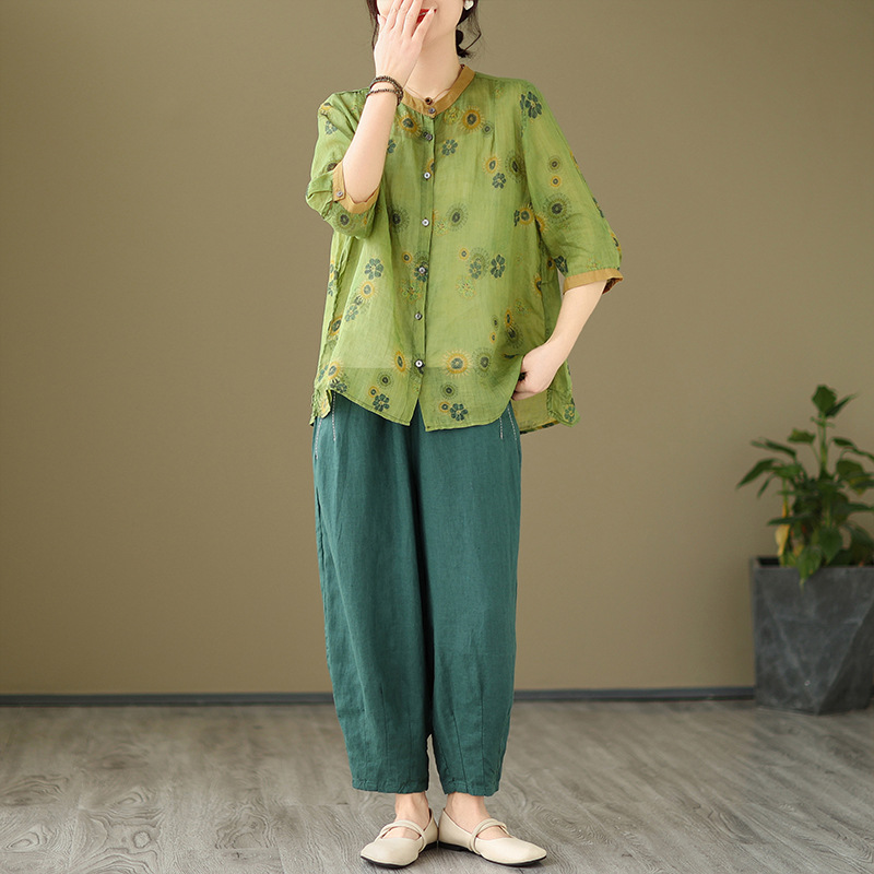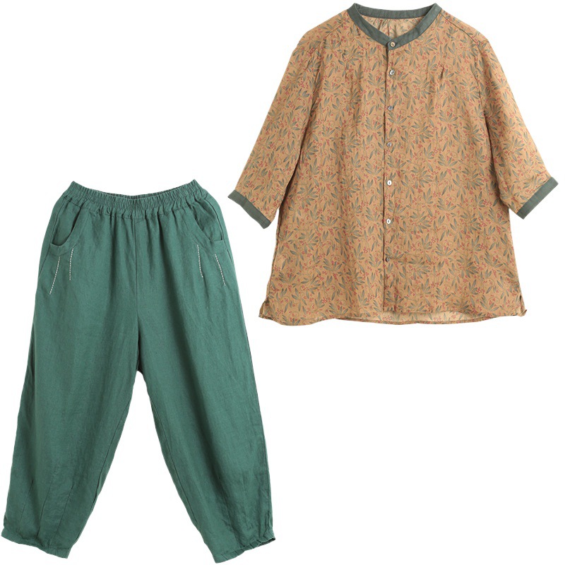 | nameOriginal | Real Shot 2024 New Korean Style Large Size Slimming Printed Artistic Retro Two-Piece Fashionable Cotton and Linen Summer Suit for Women |