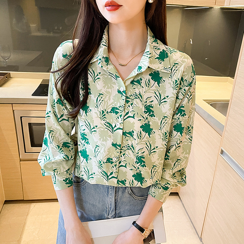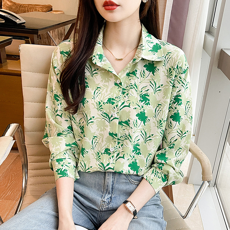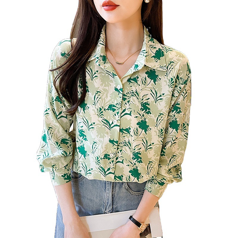 Real shot 2024 new style French design sense fashion printed long sleeve top all-match thin chiffon shirt women