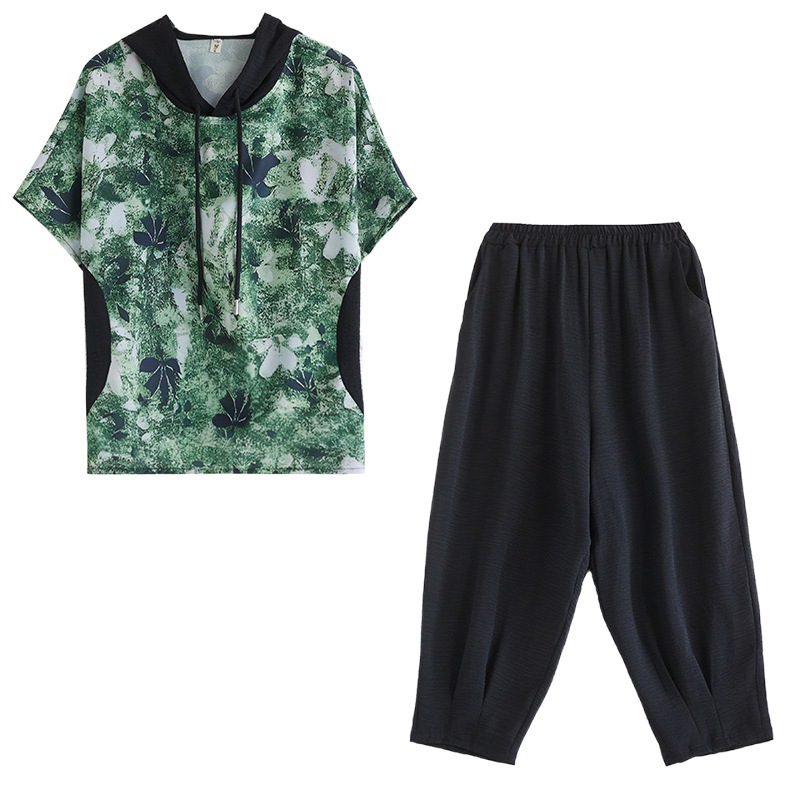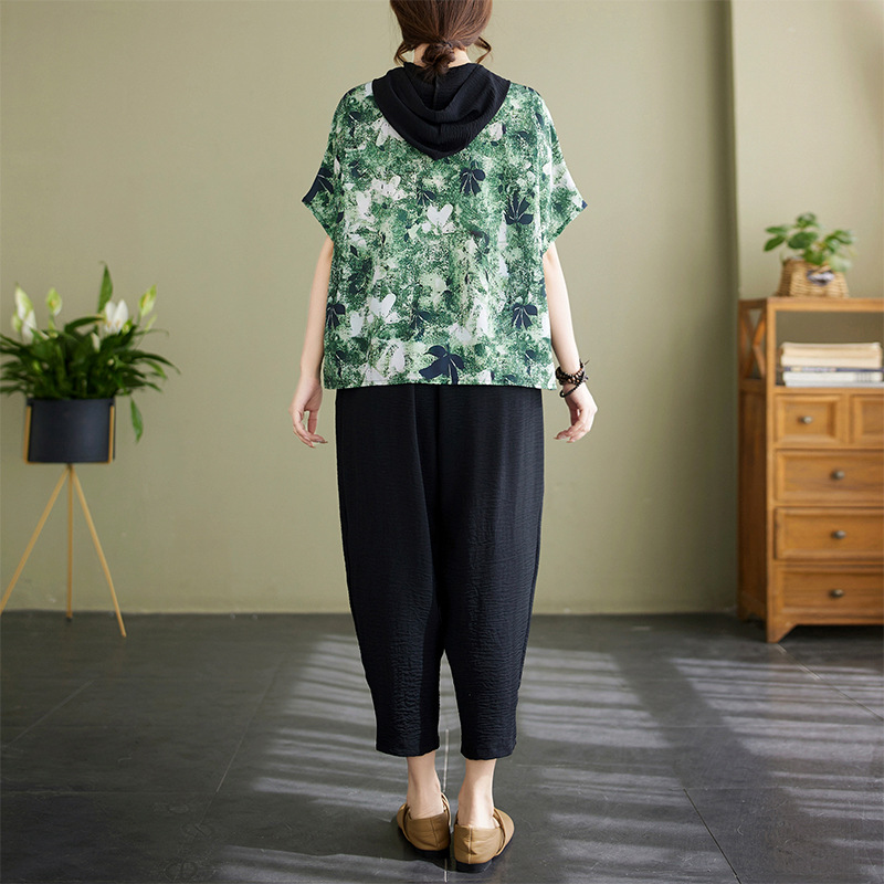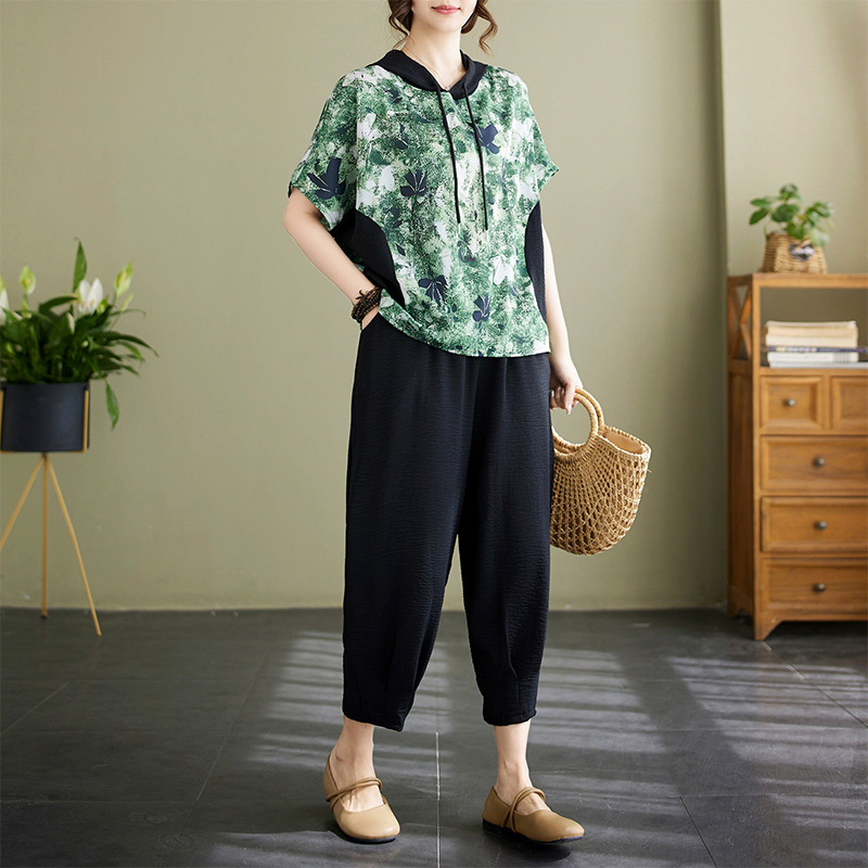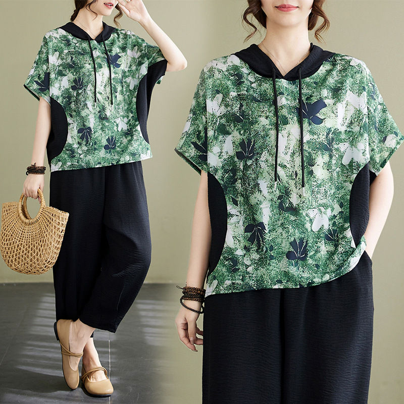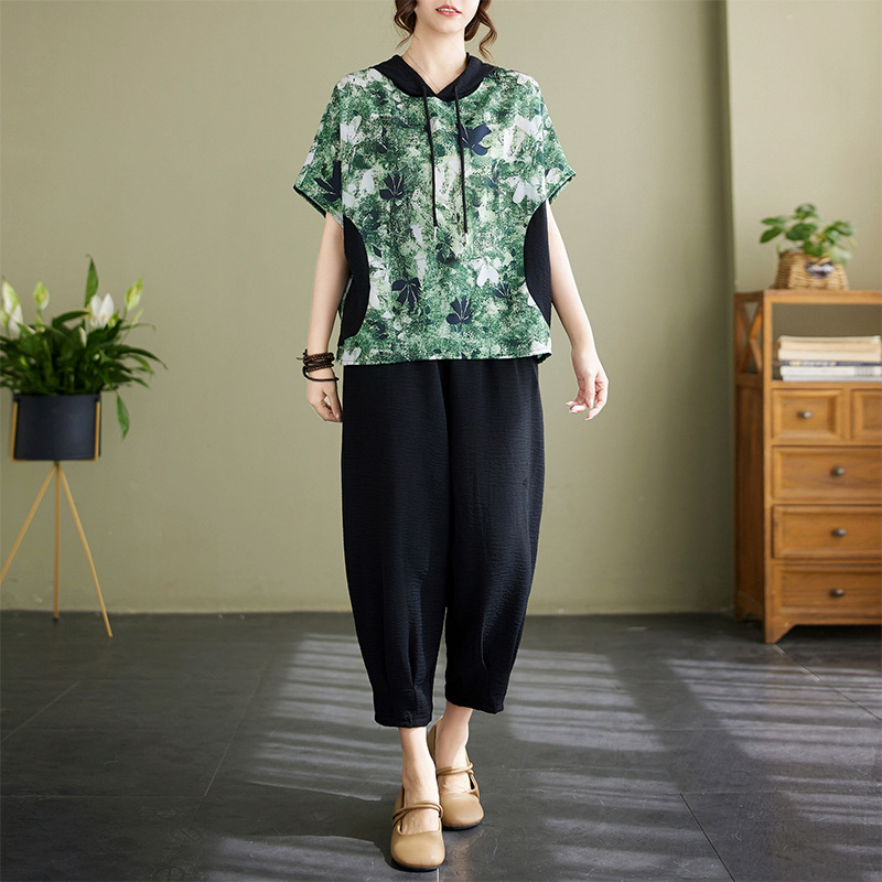 | nameOriginal | Real shot 2024 spot summer new literary printing stitching hooded loose top elastic waist wide leg pants two-piece set |