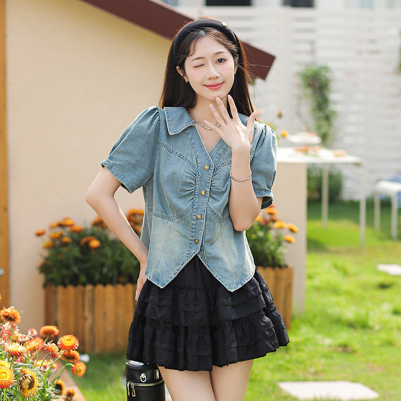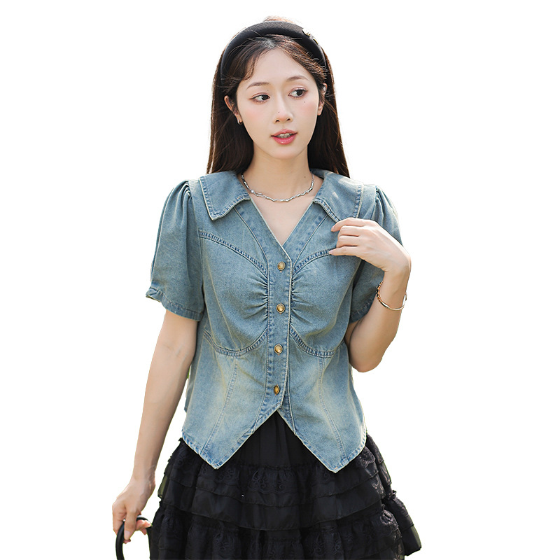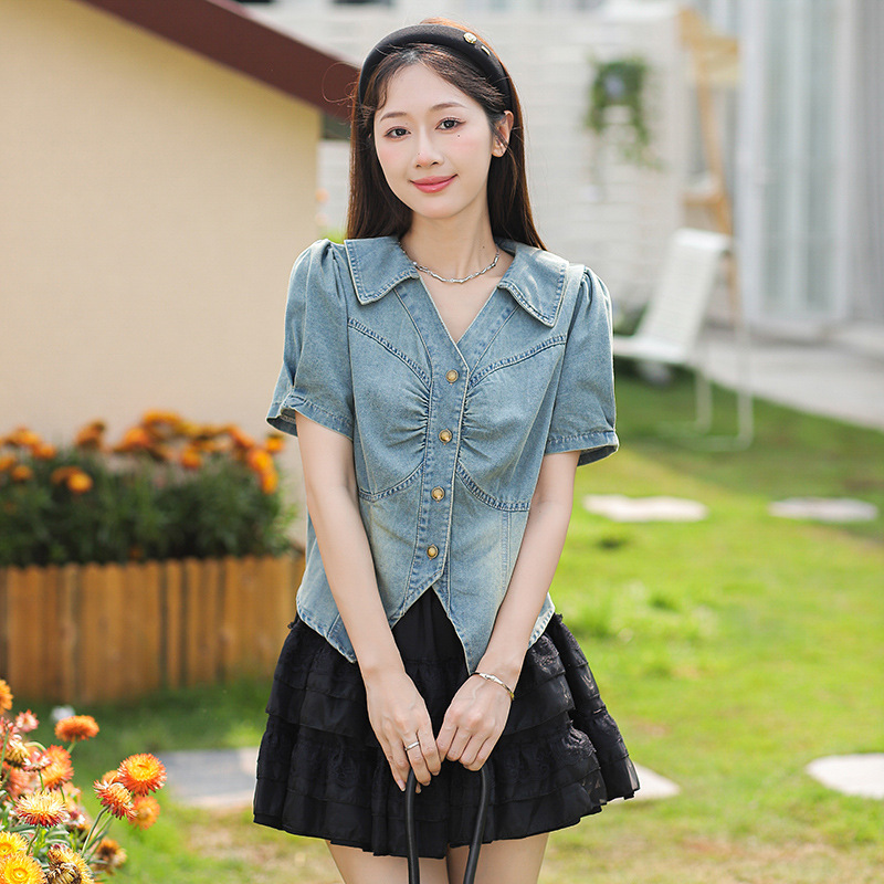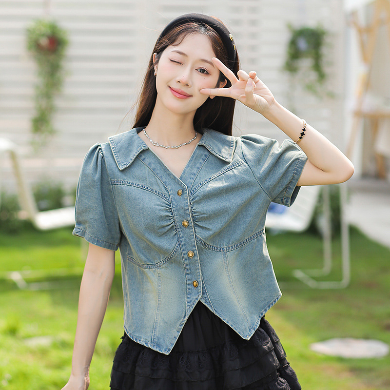 | nameOriginal | Real shot 2024 summer Korean version of small design sense niche retro Denim short sleeve shirt top women's shirt |