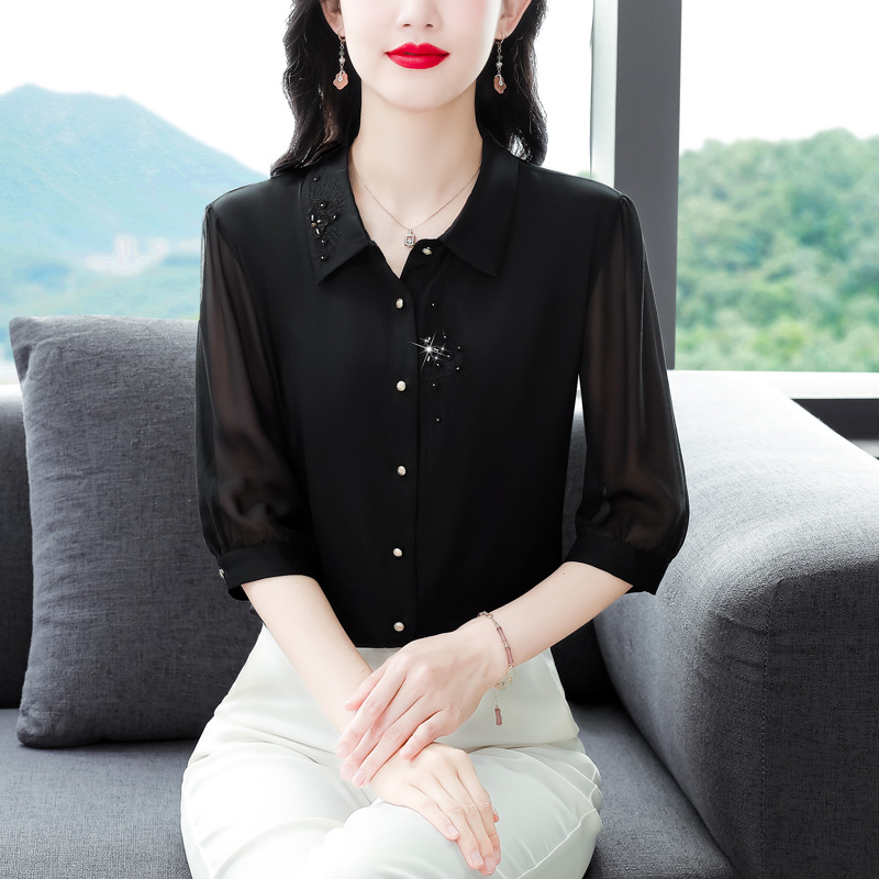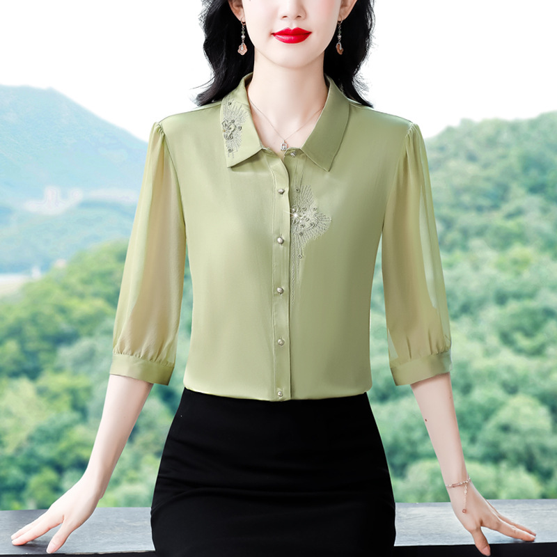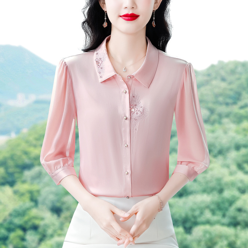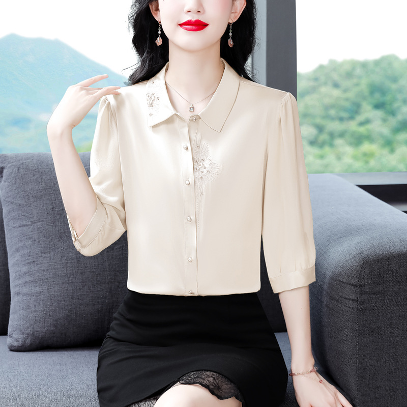 Real Shot 2024 Summer Mid-Sleeve Silk Shirt Women's Embroidered Beaded plus size Age-Reducing Western Style All-Match Small Shirt