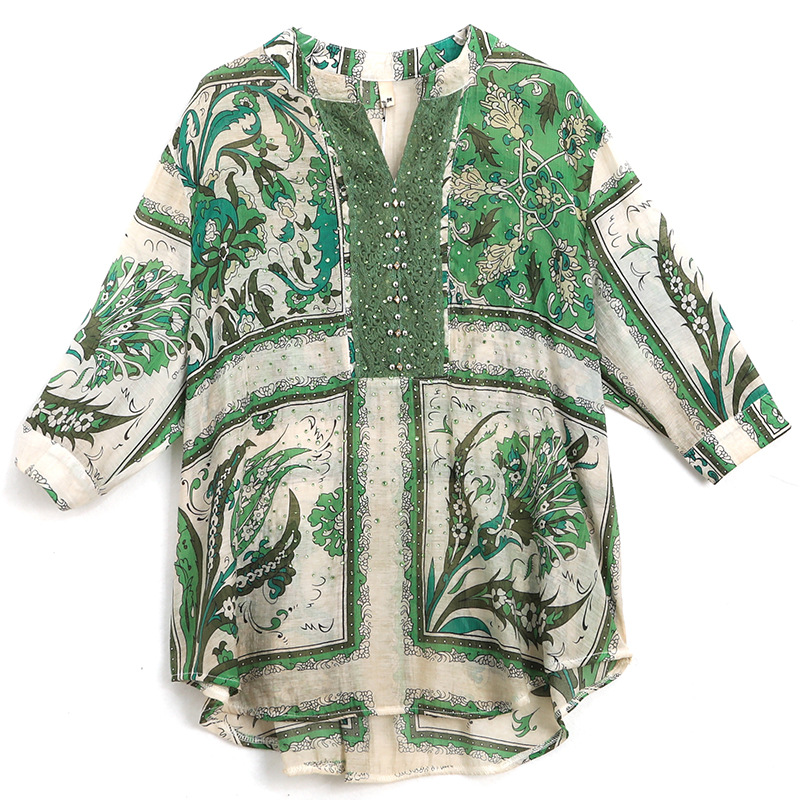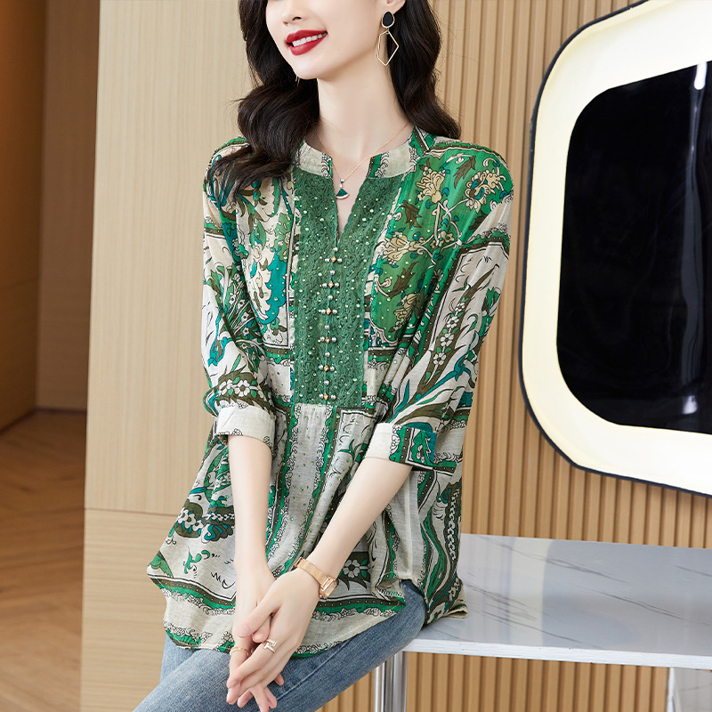 | nameOriginal | Real Shot 2024 Summer New Age-reducing Printed Top Women's Heavy-duty Hot Drilling V-neck Short-sleeved Tempel Cotton Shirt for Sun Protection |