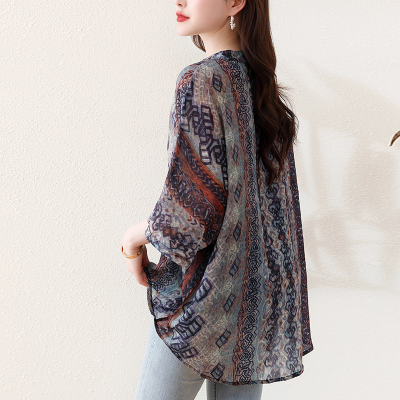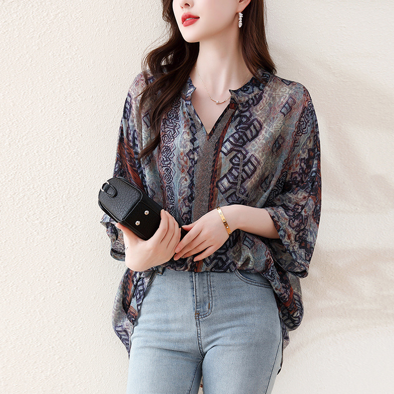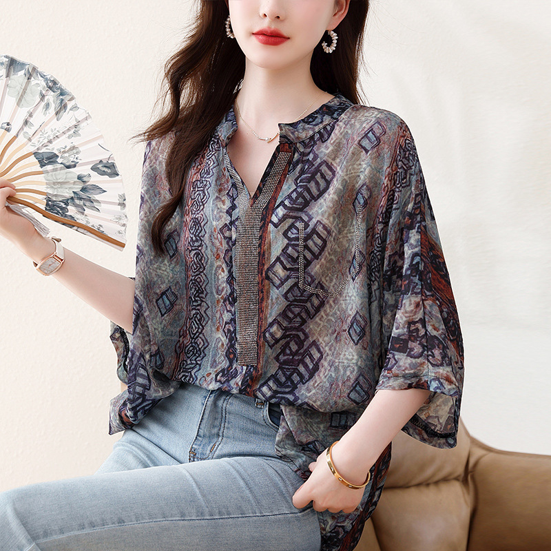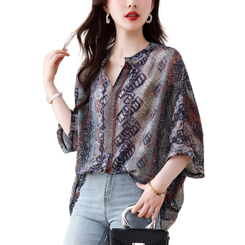 | nameOriginal | Real shot 2024 summer new plus size women's printed top heavy-duty hot drilling V-neck short sleeve chiffon shirt sunscreen |