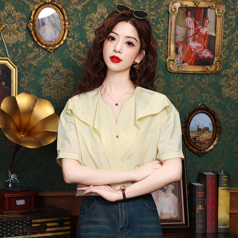| nameOriginal | Real shot 2024 summer new ruffled v-neck temperament short sleeve shirt French commuter design simple shirt |