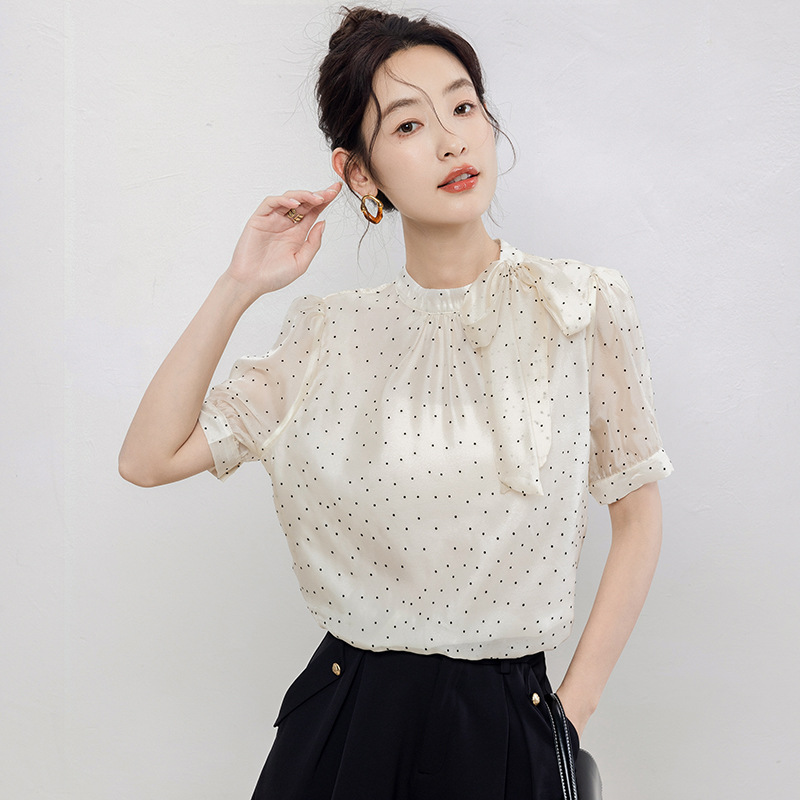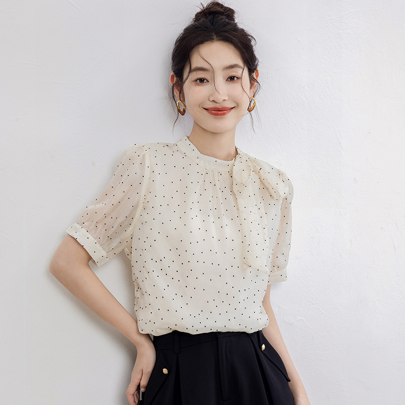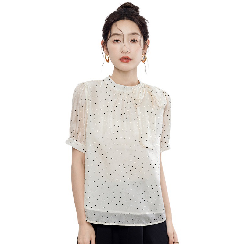 | nameOriginal | Real shot 2024 summer new small fresh sweet lady half high collar short sleeve wave dot chiffon top |