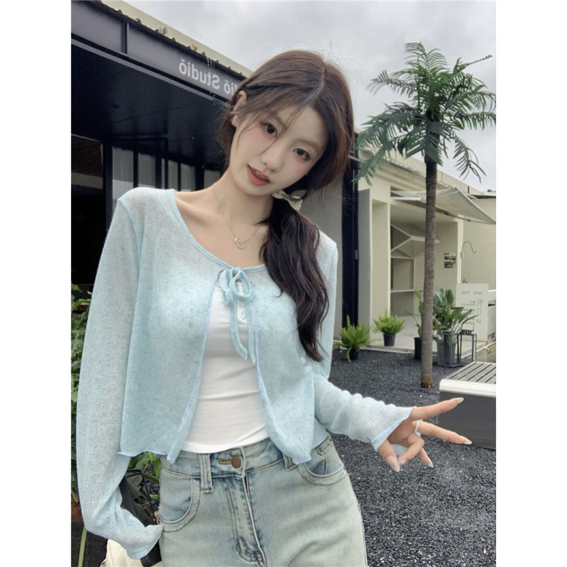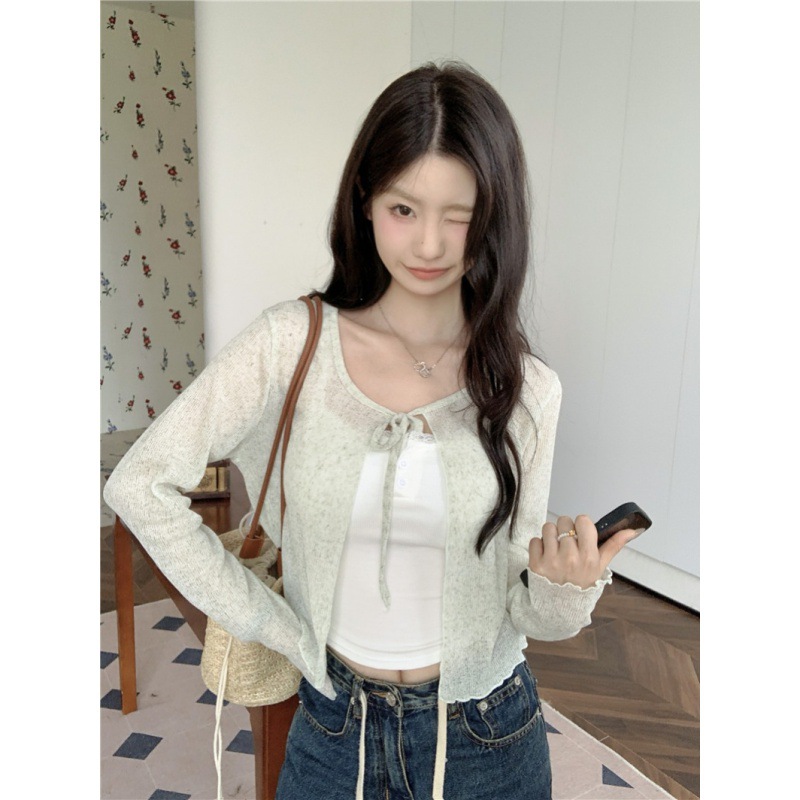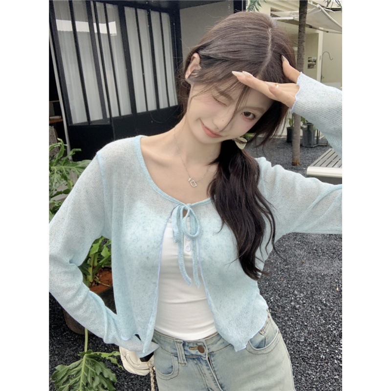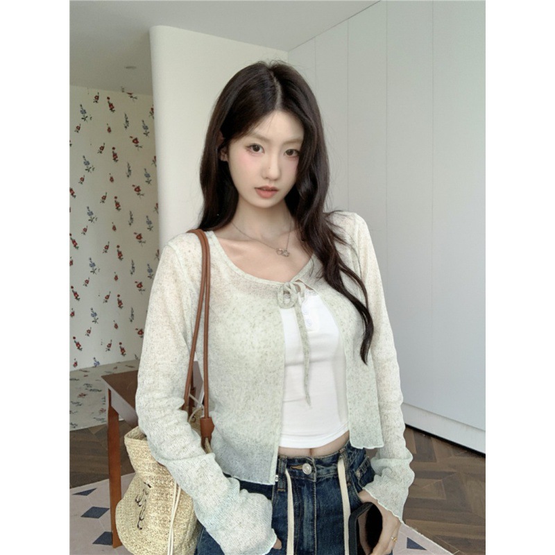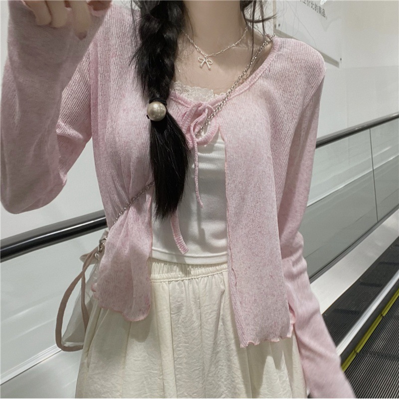 Real shot 2024 summer new thin V-neck lace-up sunscreen long sleeve cardigan women