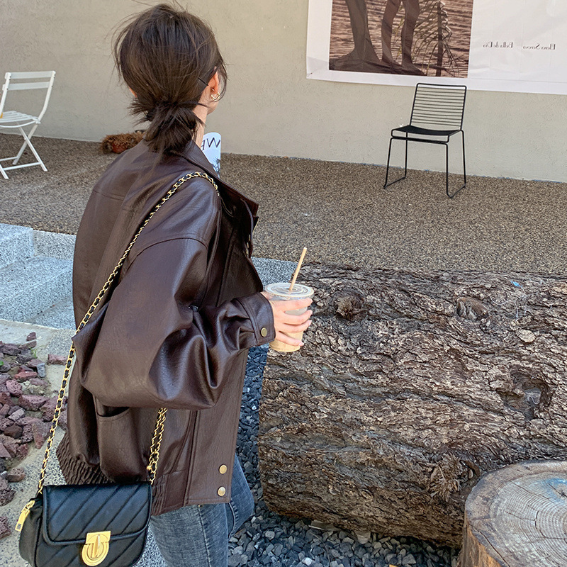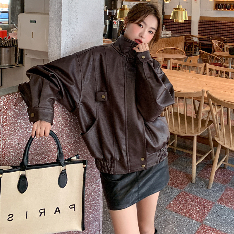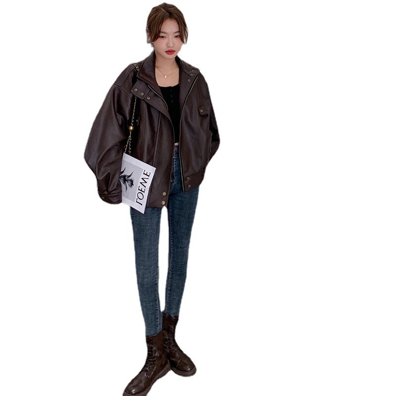 | nameOriginal | Real shot all-match retro stand collar leather garment port style Western texture relaxed-fit matte wide-shaped PU leather jacket for women |