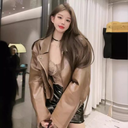 Real shot ~ American retro PU leather coat women’s spring, autumn, autumn and winter short heavy industry Maillard wear motorcycle jacket