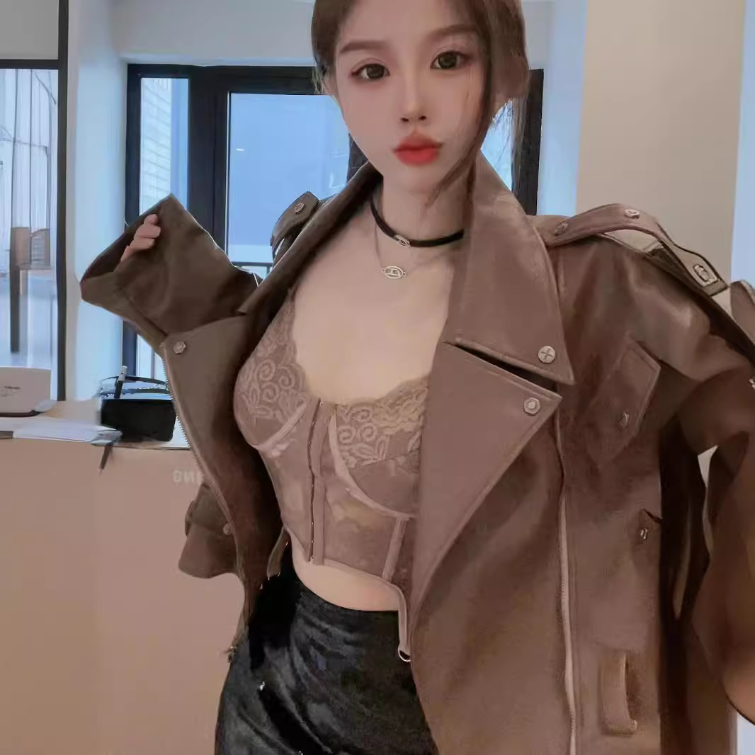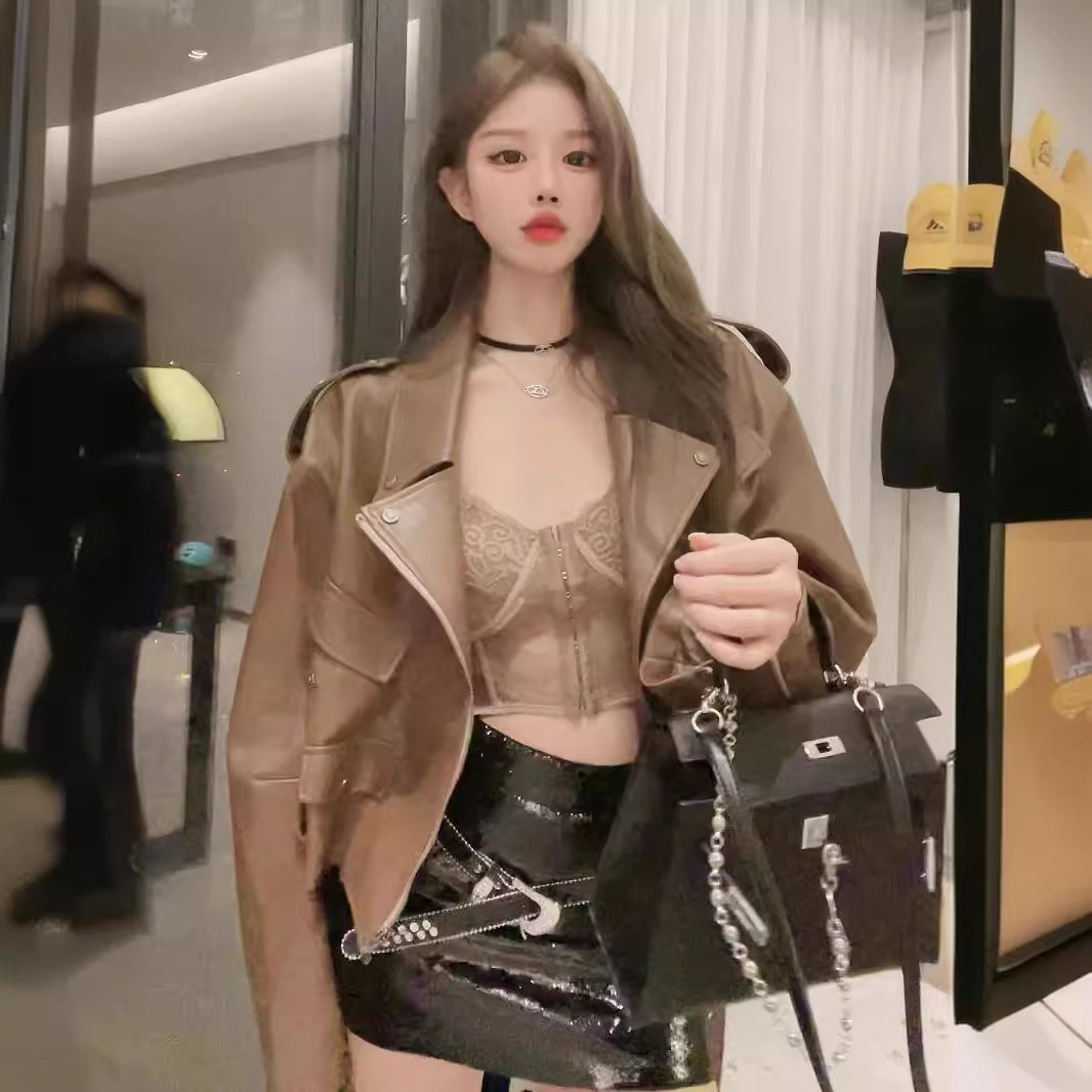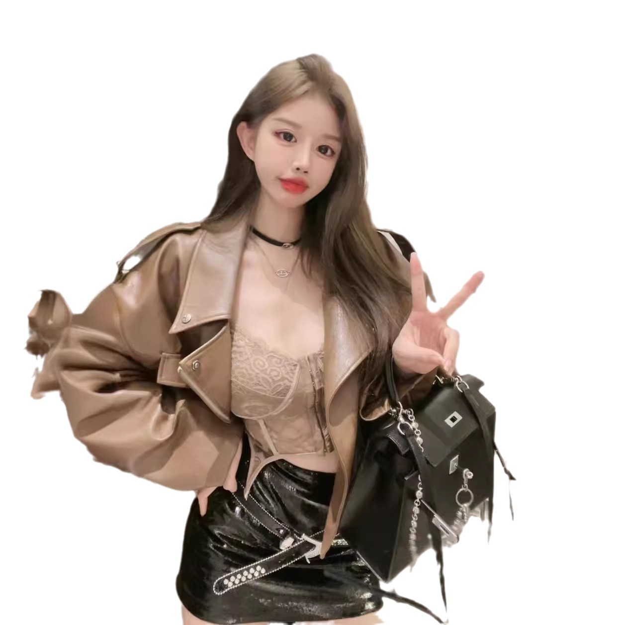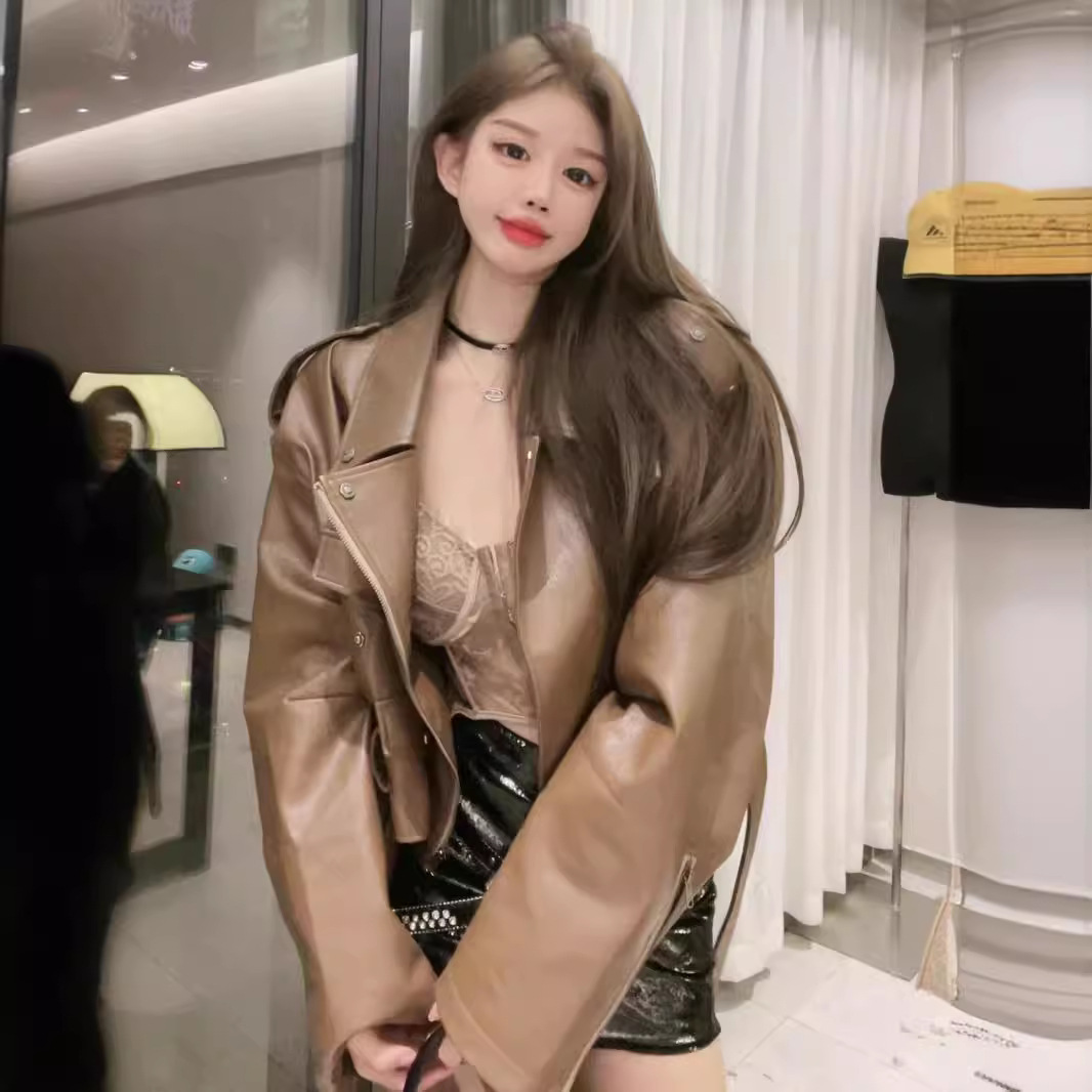 Real shot ~ American retro PU leather coat women's spring, autumn, autumn and winter short heavy industry Maillard wear motorcycle jacket