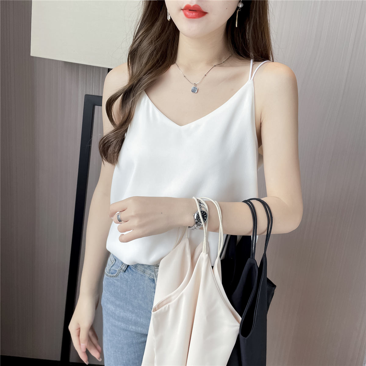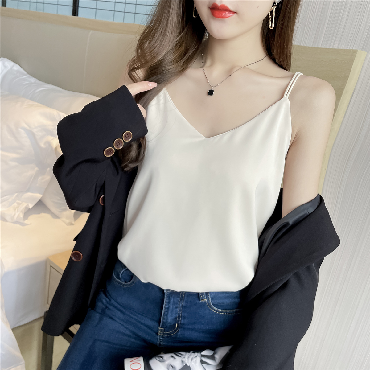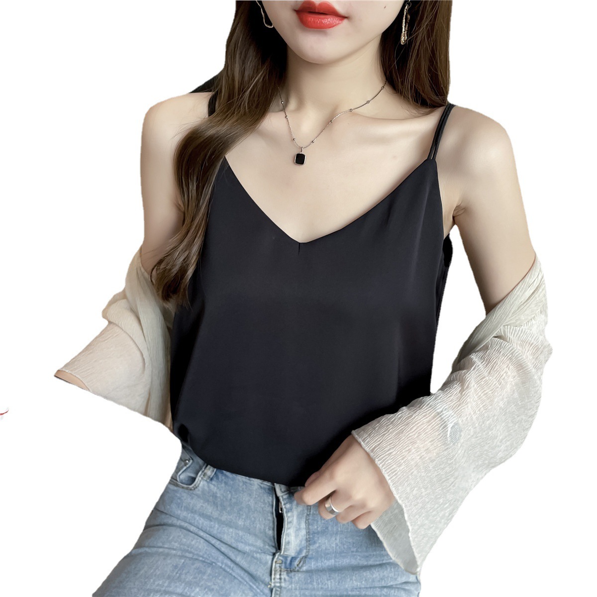 Real shot! Chiffon Camisole Women's Summer Wearing Outer Wear V-Neck Black and White Base Shirt Top