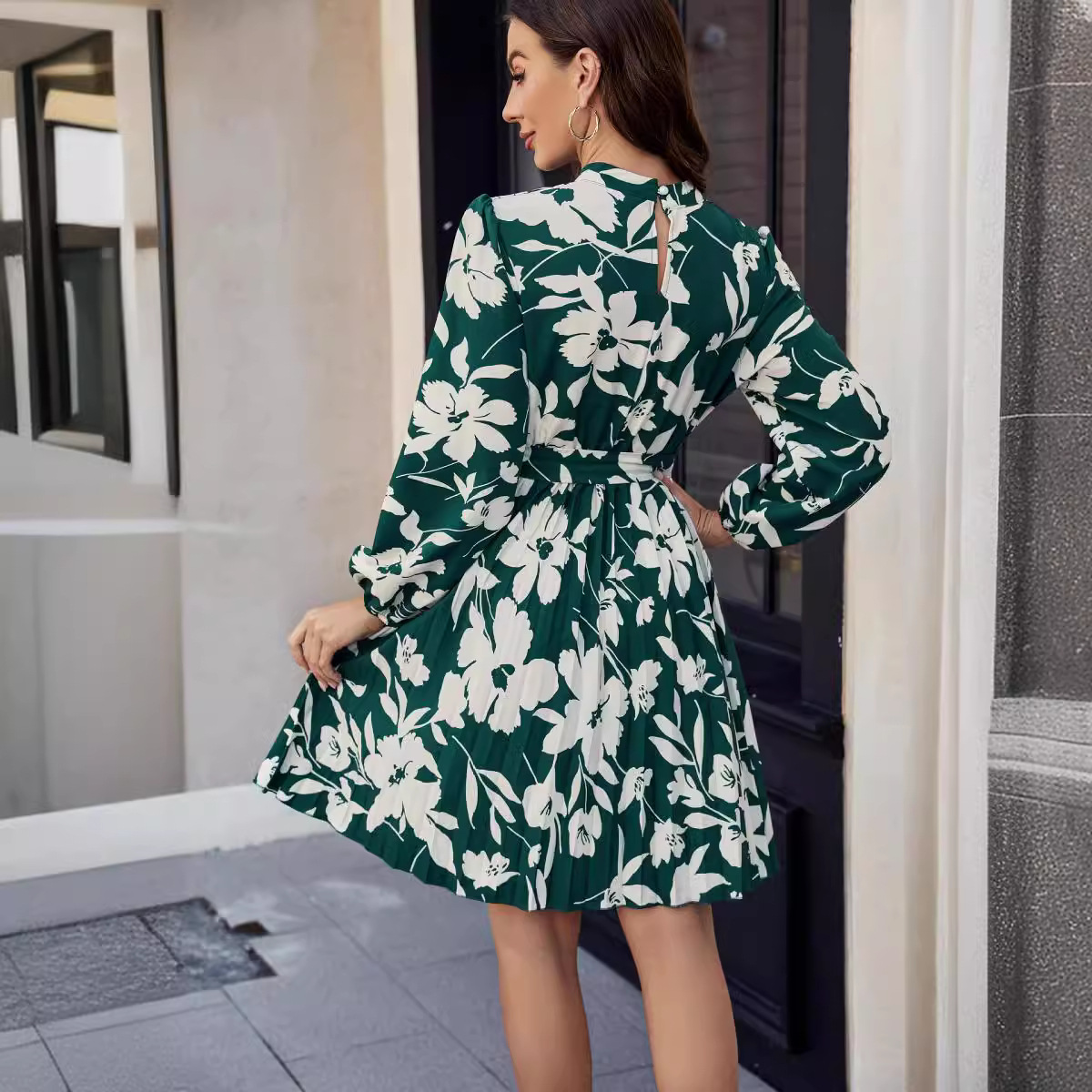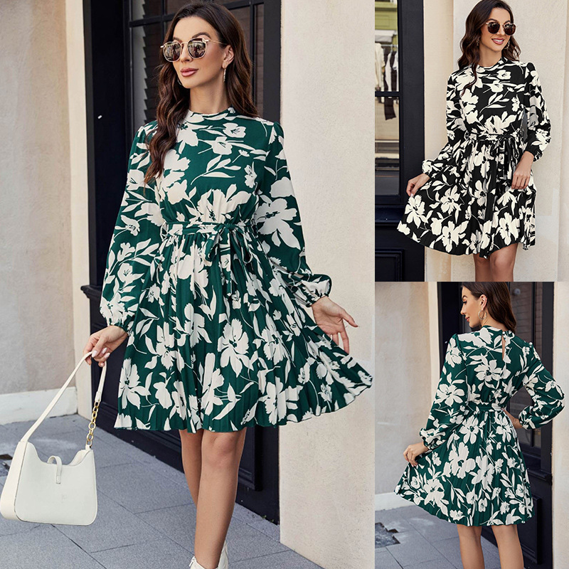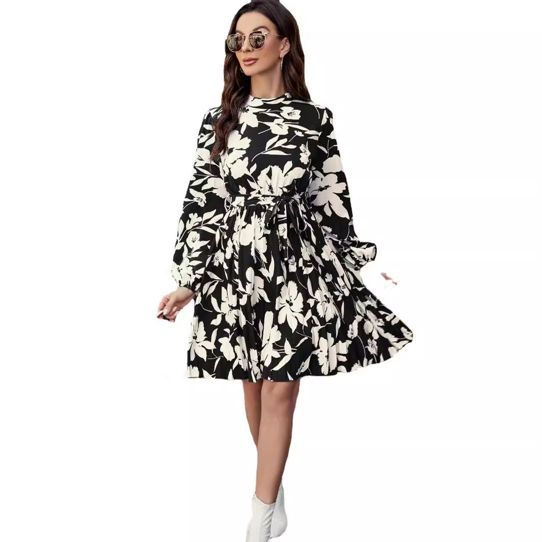 | nameOriginal | Real shot cross-border foreign trade European and American women's clothing 2024 spring Amazon print pleated lace-up waist long sleeve dress |