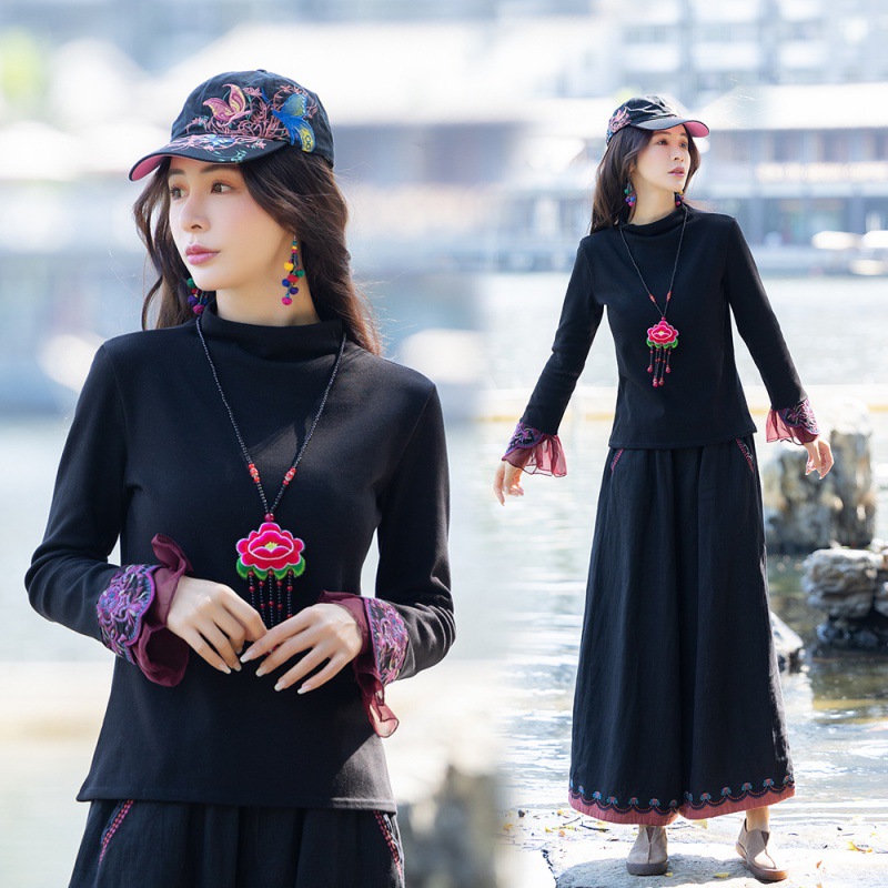 | nameOriginal | Real shot ethnic style 2021 embroidered high collar long sleeve waist slimming base shirt pullover autumn and winter top |