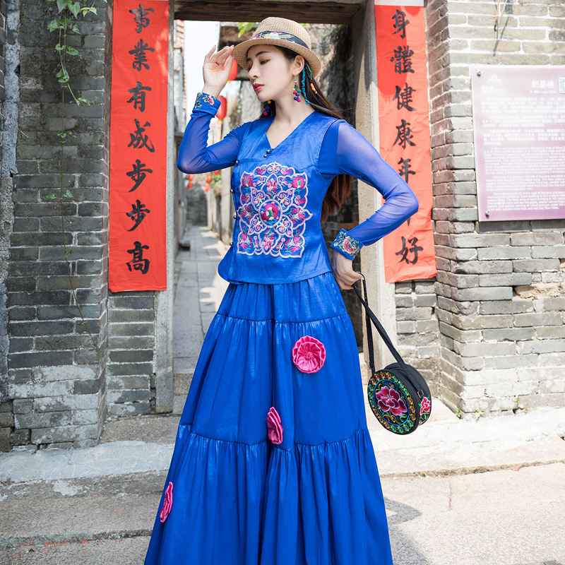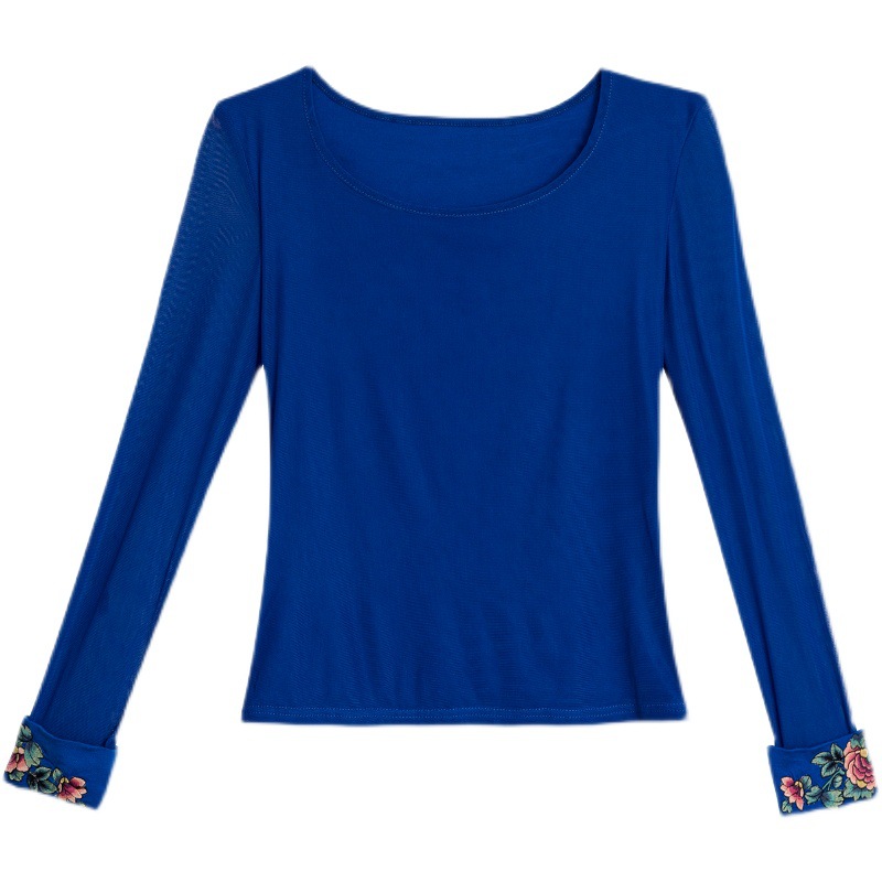 Real Shot Ethnic Style Mesh Stitching Cuff Embroidered Design All-match Round Neck Base Large Size Women
