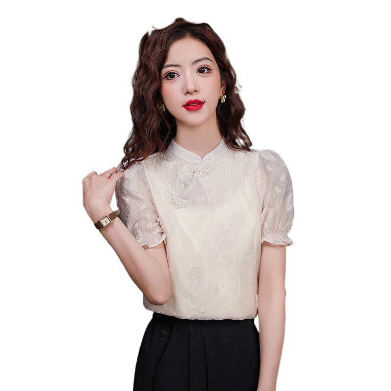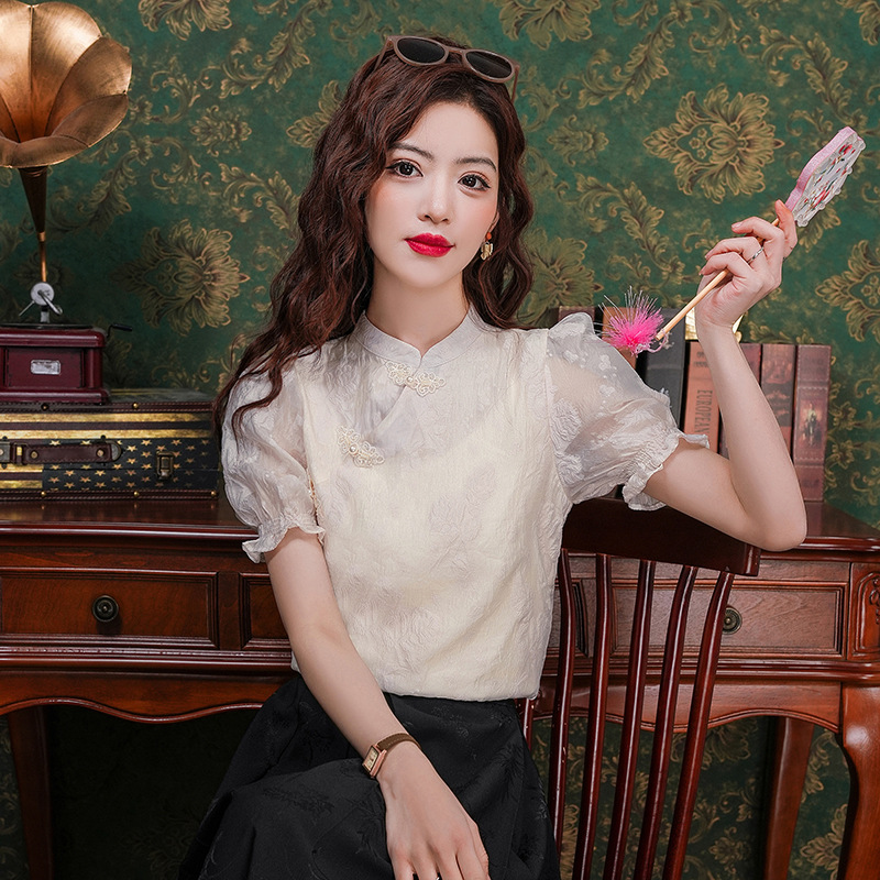 | nameOriginal | Real Shot Fashion New Chinese Puff Sleeve Shirt Sweet Jacquard Western Style National Style Buckle Chic Beautiful Short Sleeve Top |