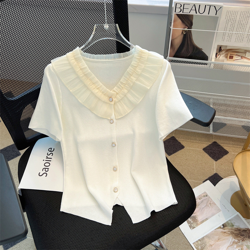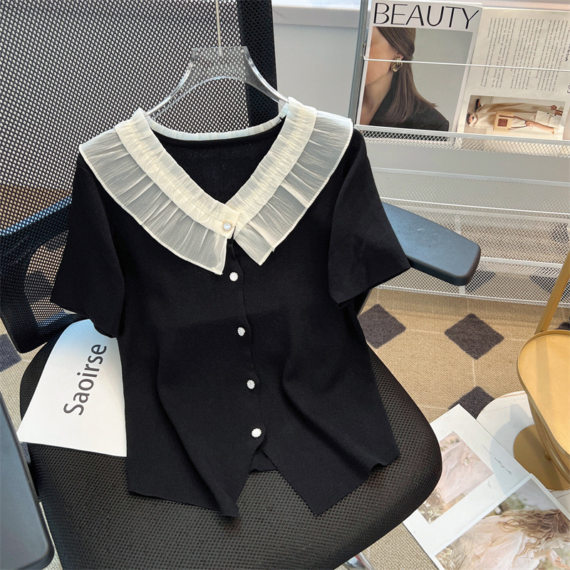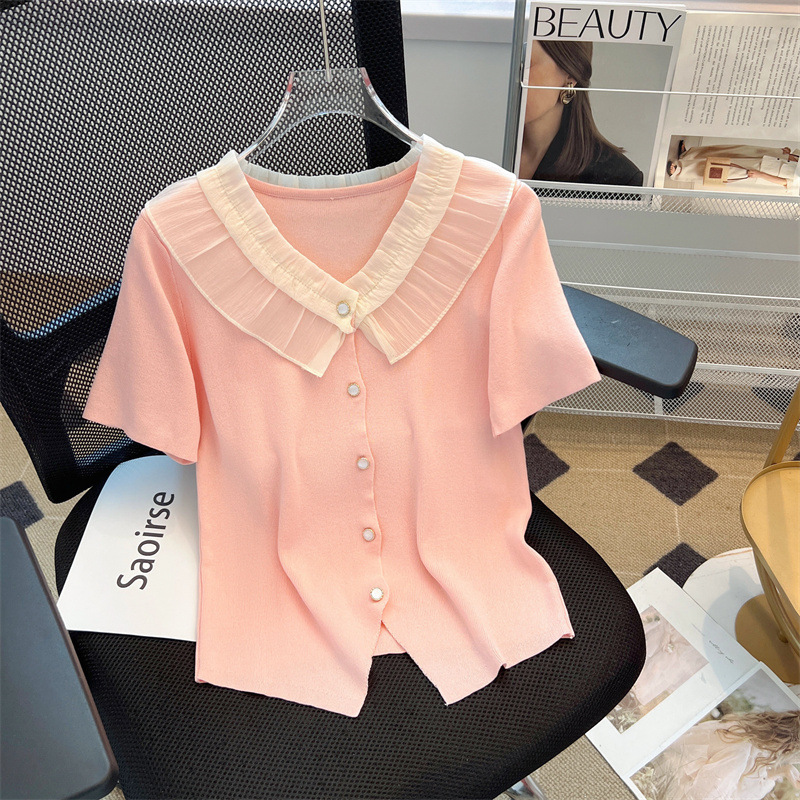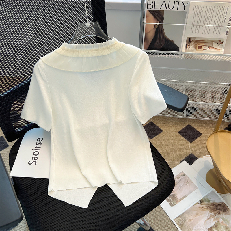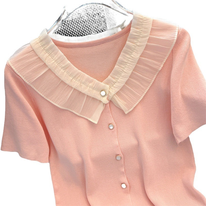 | nameOriginal | Real Shot High-end Sense Stretch Waist Doll Collar Top Women's Summer New Design Sense Niche Ice Silk Thin Knitted Short Sleeve |