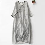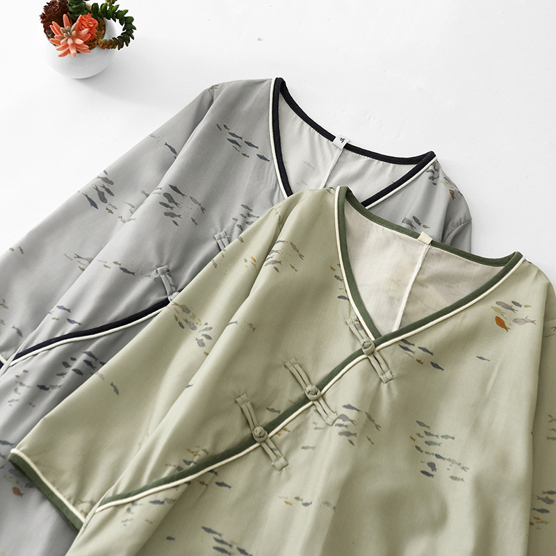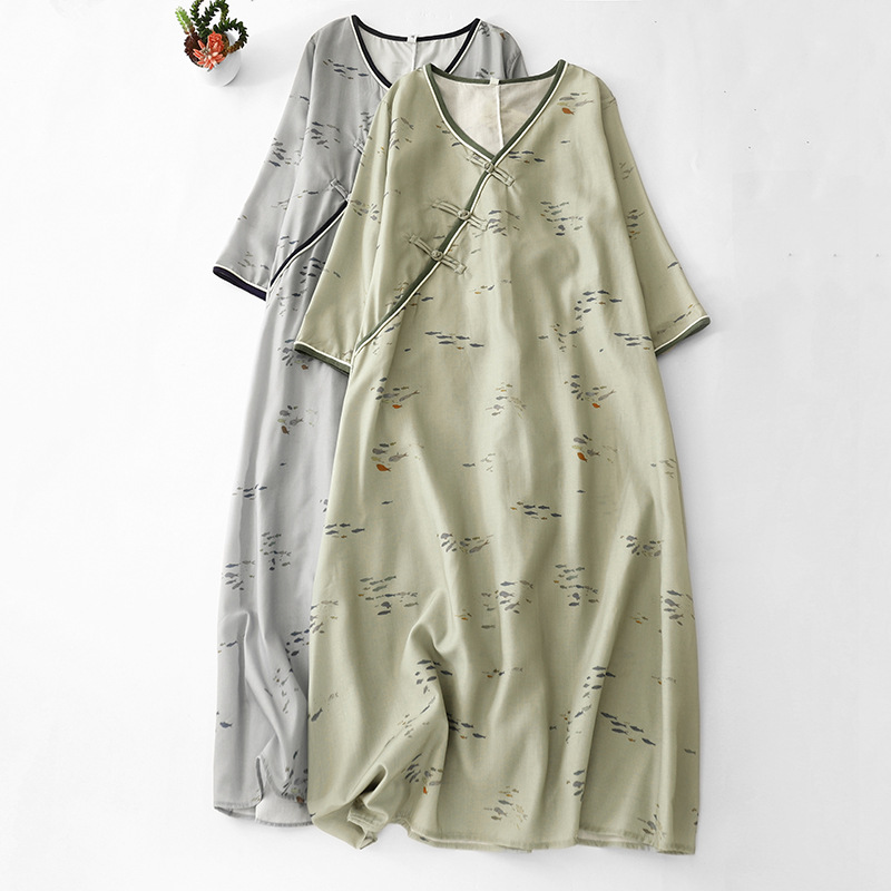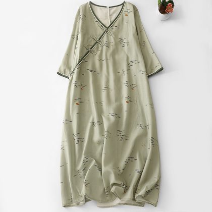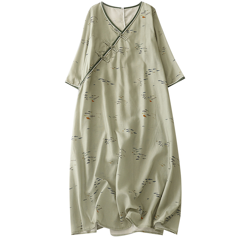 Real Shot Improved Cheongsam Printed V-neck Slant Placket Buckle dress Seven-point Sleeve Anti-fairy Gown