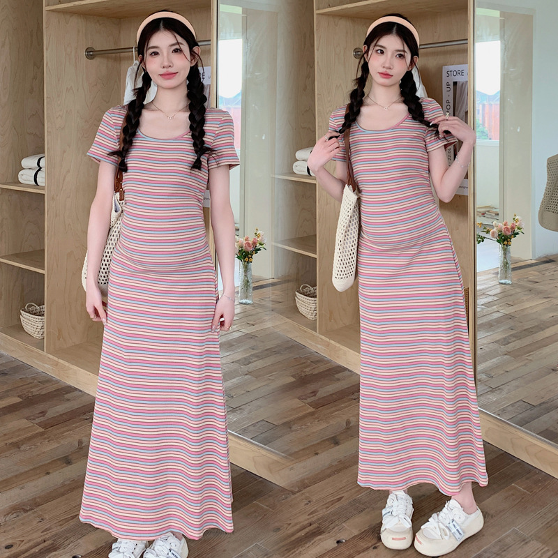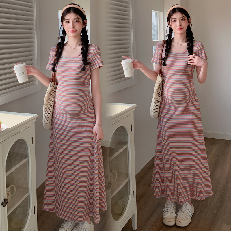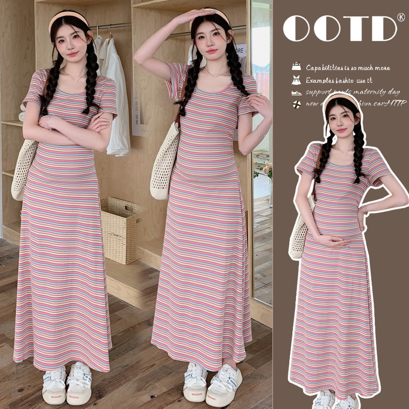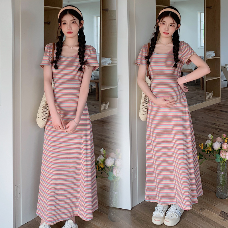 Real shot in stock ~ 2024 summer new Korean style tea break French striped design belly cover slimming pregnant women dress