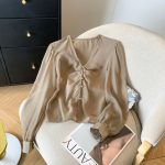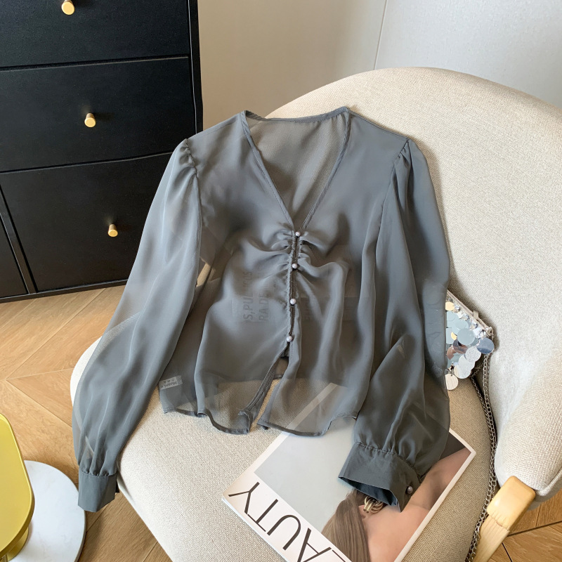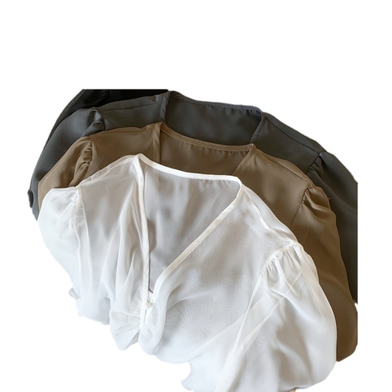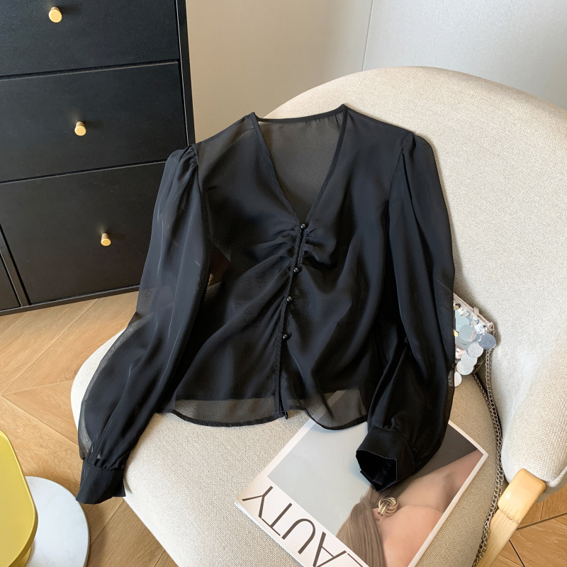 | nameOriginal | Real shot in stock chiffon micro-transparent V-neck pleated sunscreen shirt high-grade bubble sleeve all-match foreign-style perspective shirt |