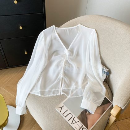 | nameOriginal | Real shot in stock chiffon micro-transparent V-neck pleated sunscreen shirt high-grade bubble sleeve all-match foreign-style perspective shirt |