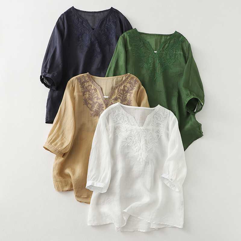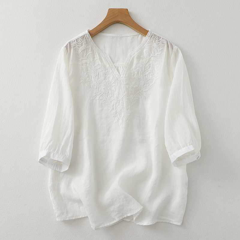 Real shot in stock plus size cotton and linen short sleeve top loose slimming embroidered retro small shirt