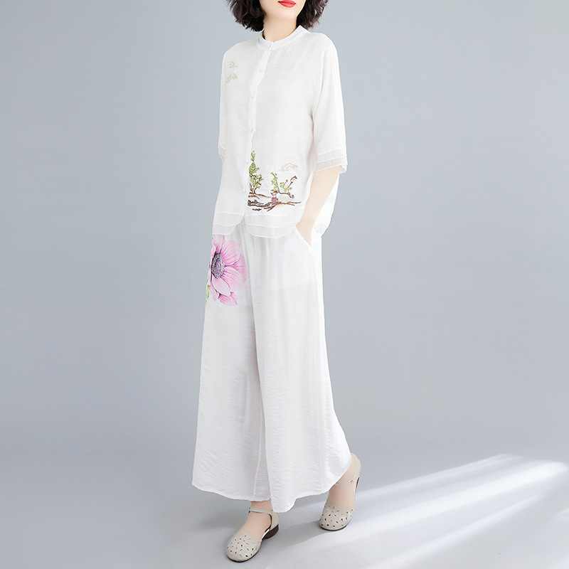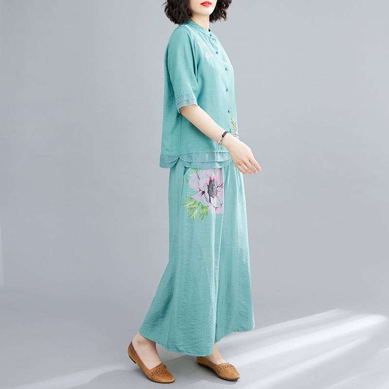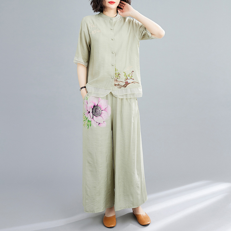 | nameOriginal | Real Shot Large Size Women's Summer Stylish Age-reducing Cotton and Linen Suit Women's Retro Ethnic Style Fashionable Wide Leg Pants Two-piece Set |