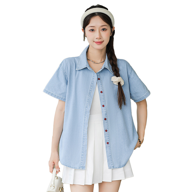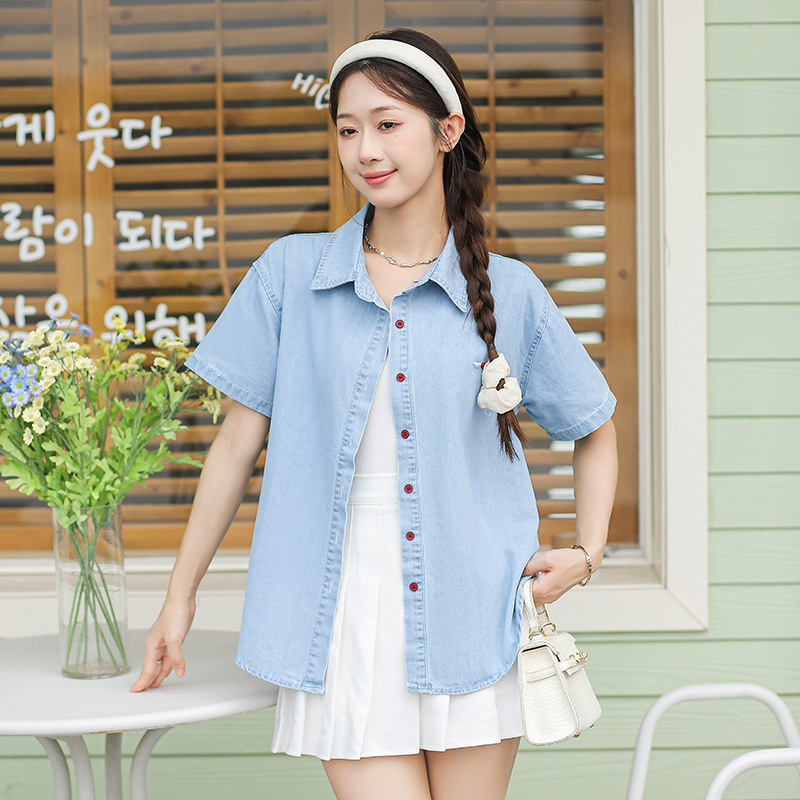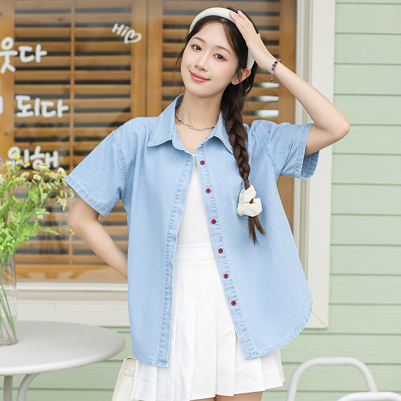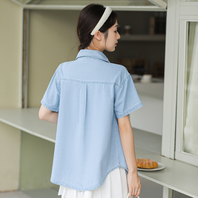 Real shot light blue Denim short sleeve shirt women's 2024 summer Korean temperament design feeling loose soft Denim shirt