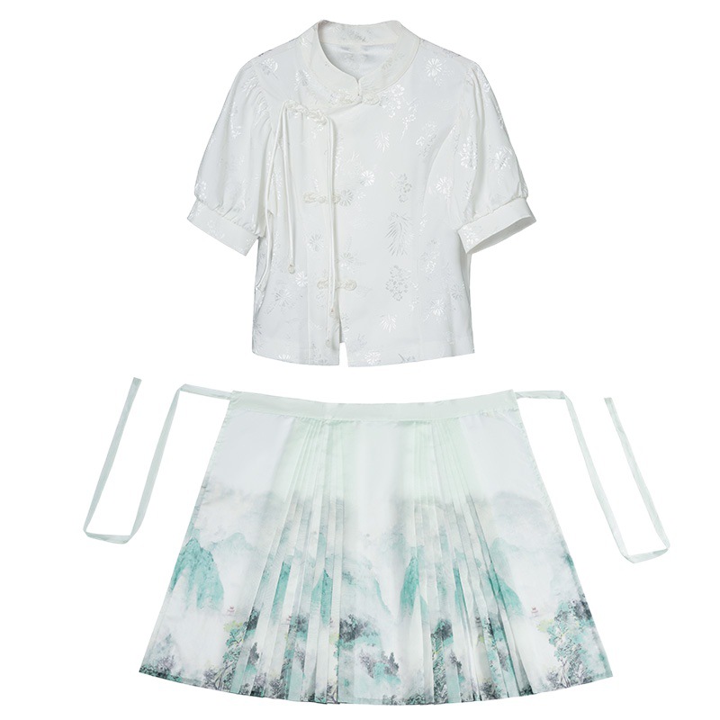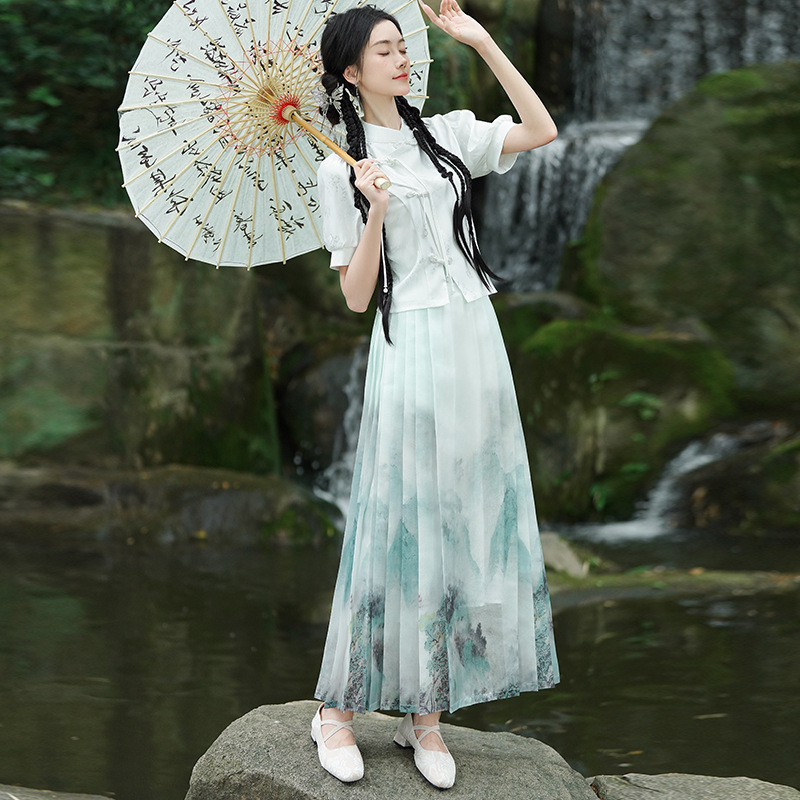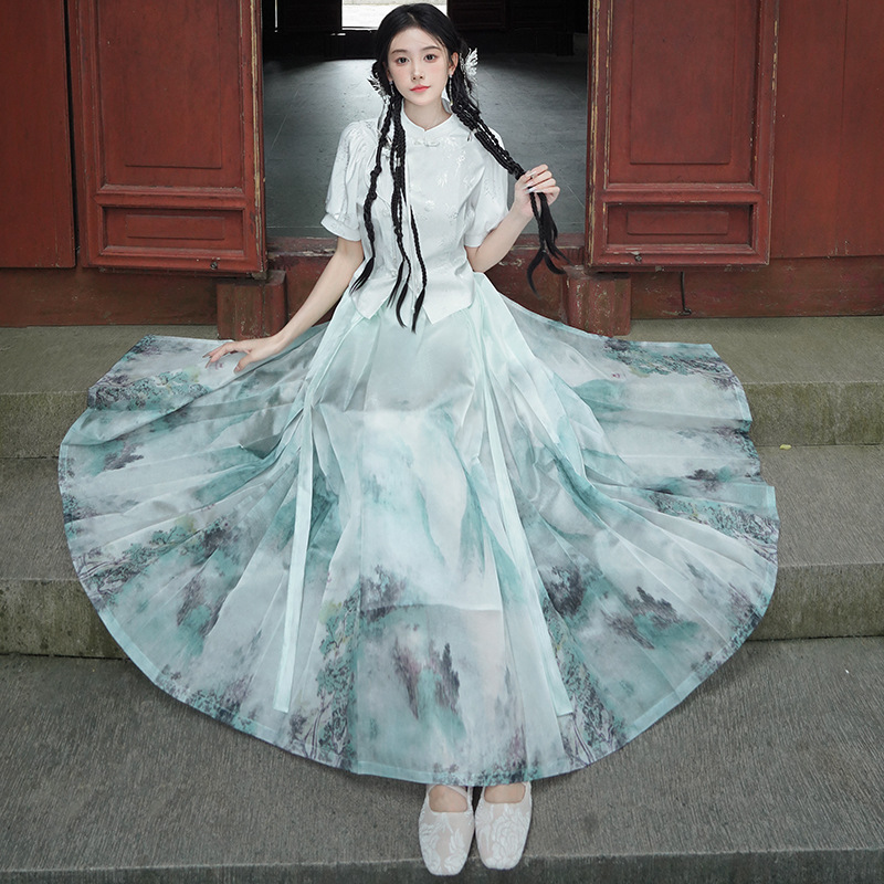 | nameOriginal | Real shot new Chinese Jacquard stand collar buckle national style short sleeve top one-piece national fashion printed horse skirt suit |