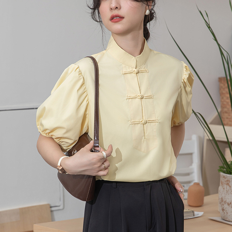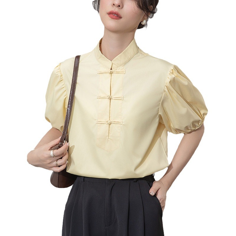Real shot new Chinese short sleeve stand collar button yellow shirt women's summer 2024 new bubble sleeve horse skirt top
