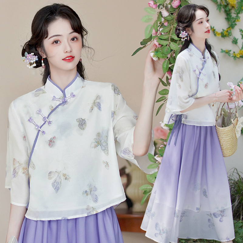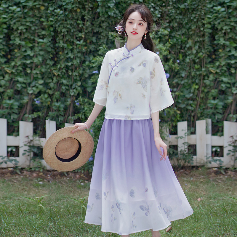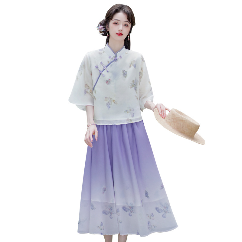 Real Shot New Chinese Style National Style Improved Cheongsam Printed Half Sleeve Top Two-Piece Fairy Style Retro Artistic Girl’s suit