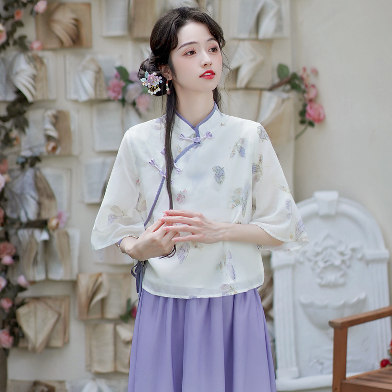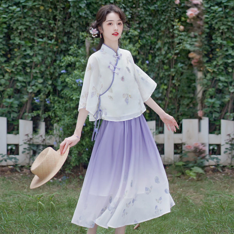 | nameOriginal | Real Shot New Chinese Style National Style Improved Cheongsam Printed Half Sleeve Top Two-Piece Fairy Style Retro Artistic Girl's suit |