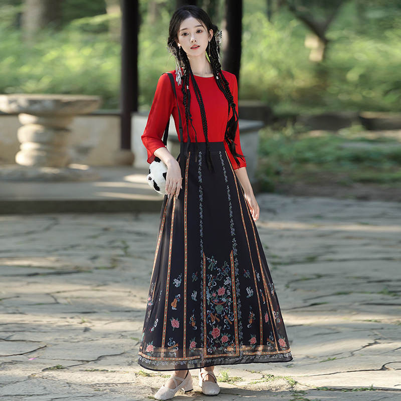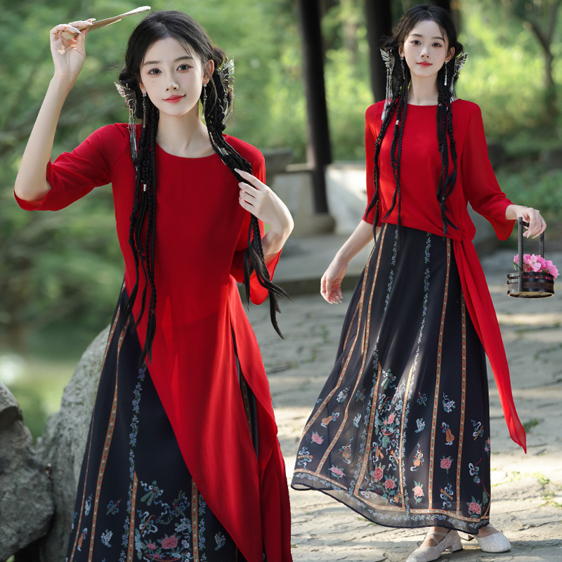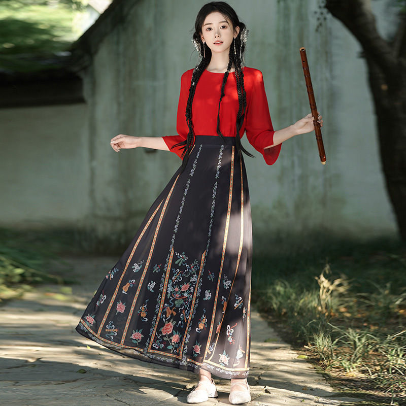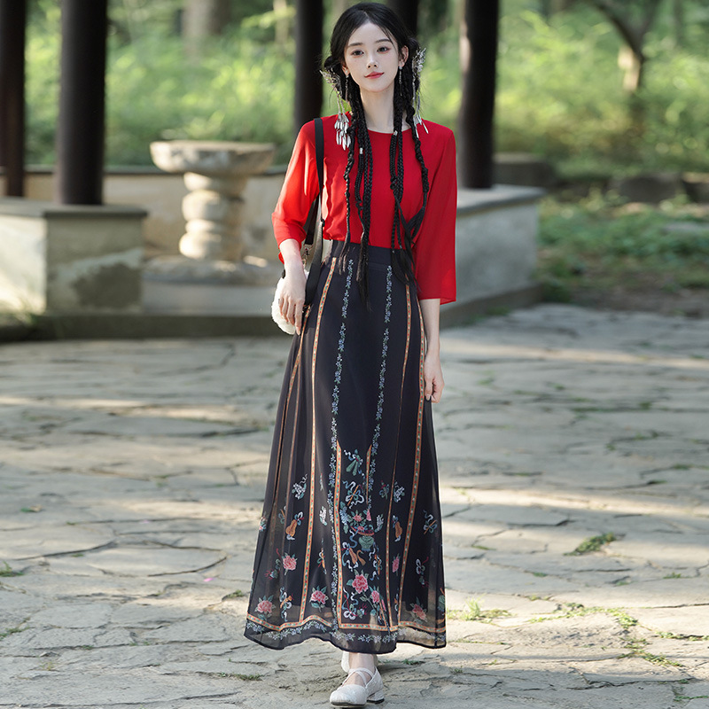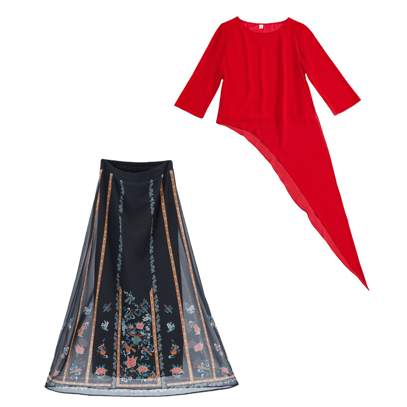 | nameOriginal | Real Shot New Chinese Style National Style Modified Round Neck Asymmetrical Mid-Sleeve Blouse All-Match Vintage Printed Horse Top Skirt suit |