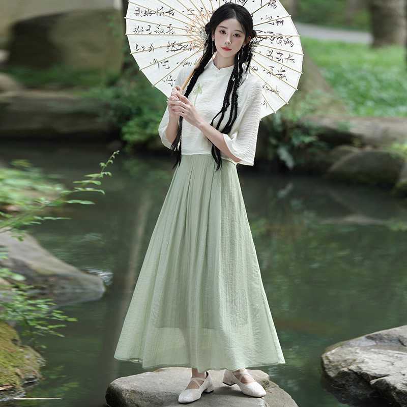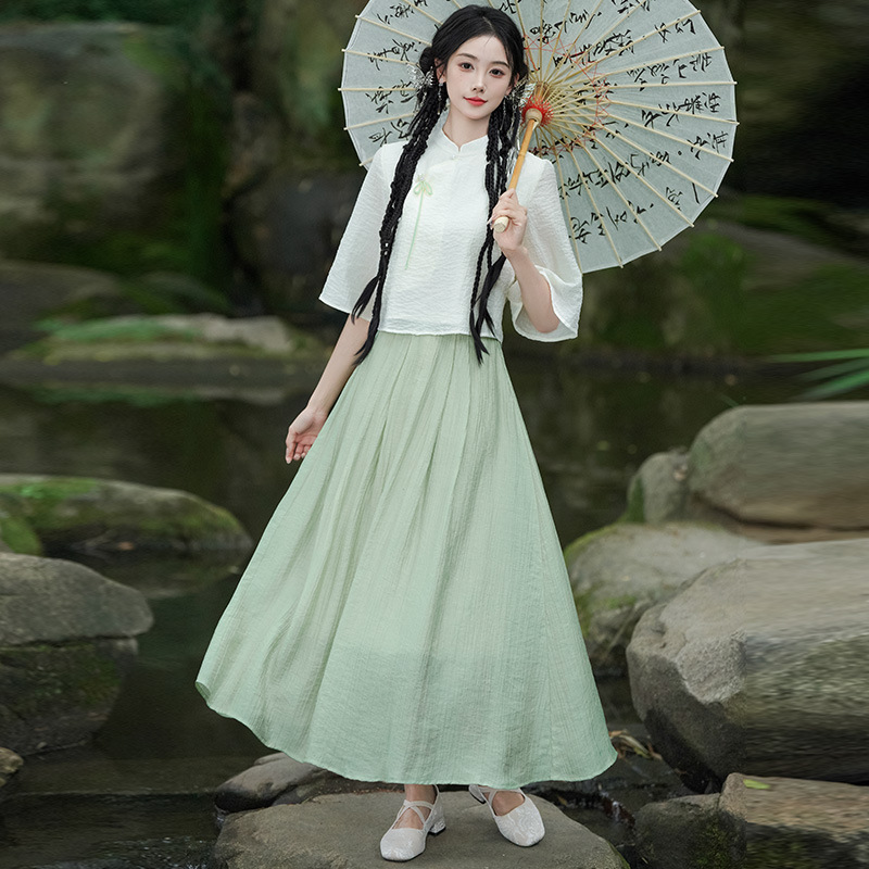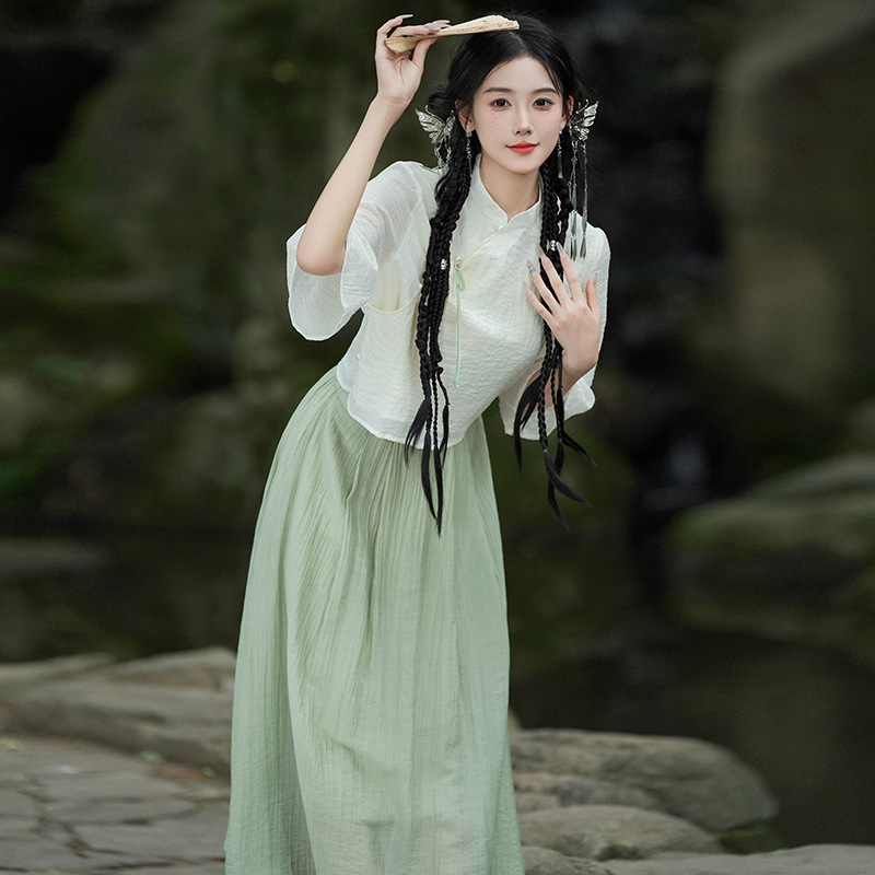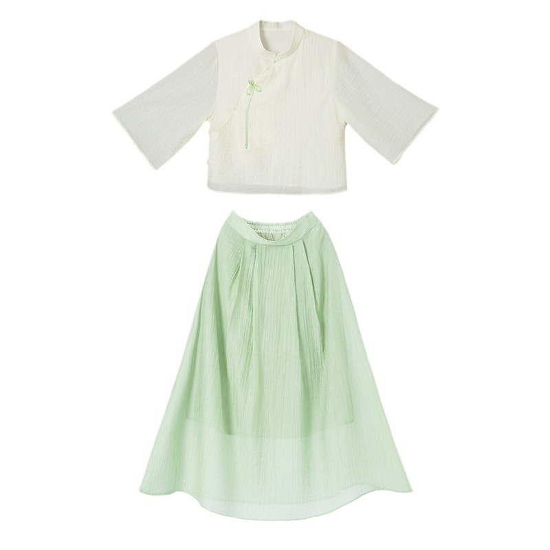 Real shot new Chinese style stand collar slanting lapel buckle Chinese style Hanfu retro mid-sleeve top modified national fashion skirt suit
