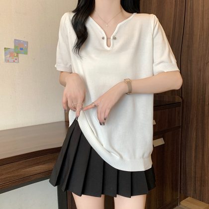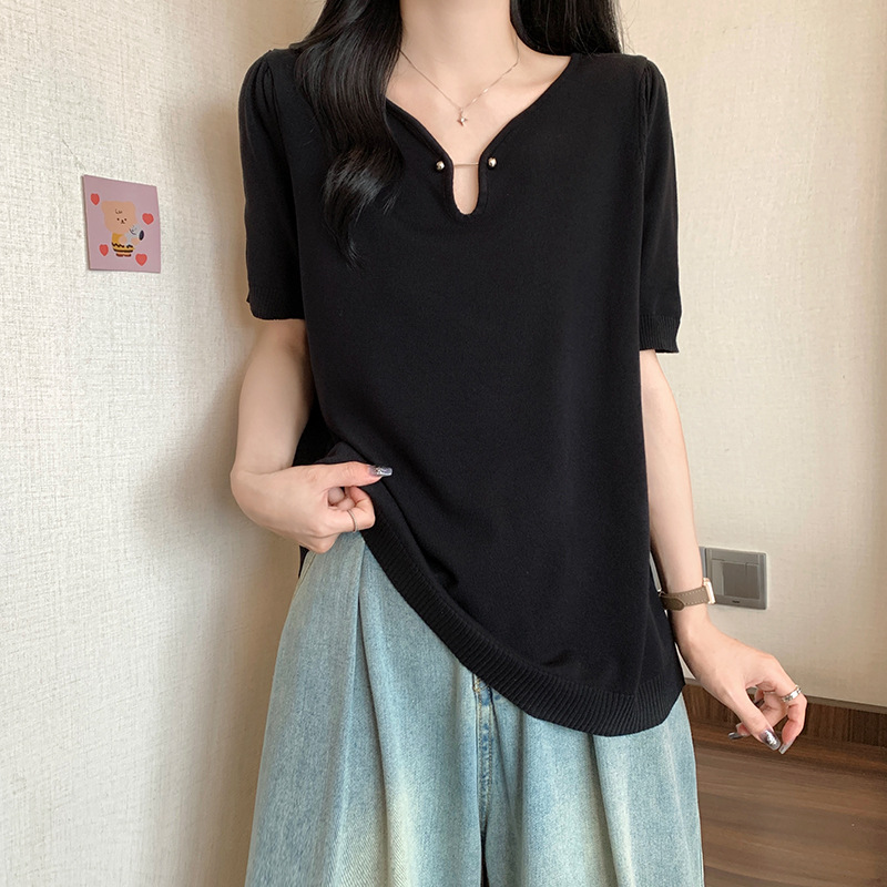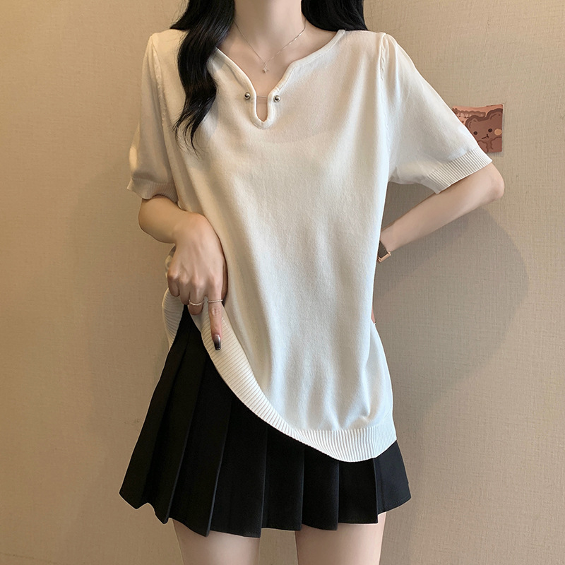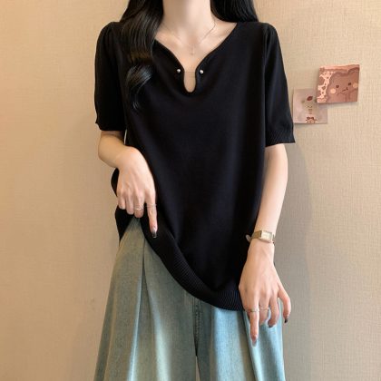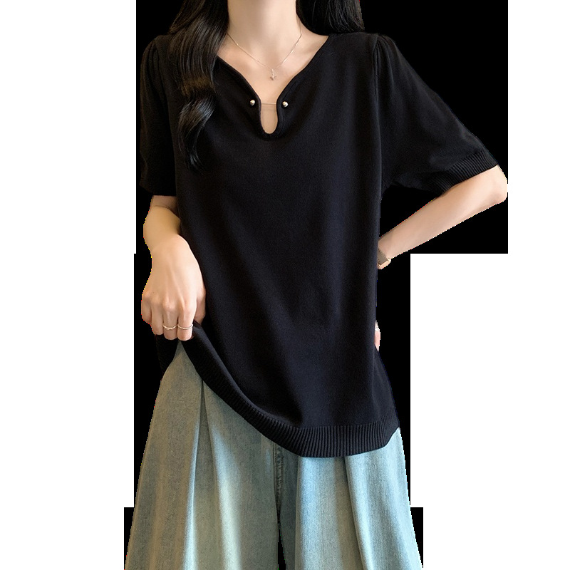 | nameOriginal | Real Shot plus size 2024 Summer New Loose All-match Half-open Collar Ice Silk Short Sleeve chubby girl Simple Knitted Shirt Top |