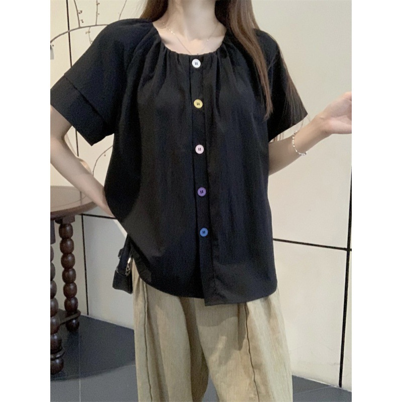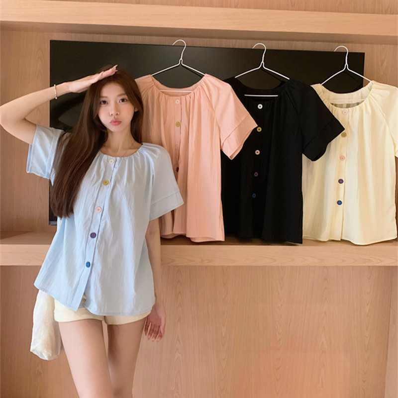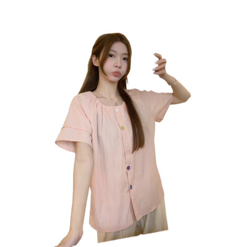 Real Shot plus size chubby girl Korean Style Elegant Puff Sleeve Candy Button Loose Age-reducing Slimming Round Neck Short Sleeve Shirt for Women