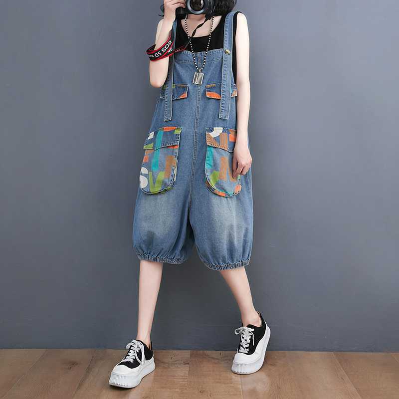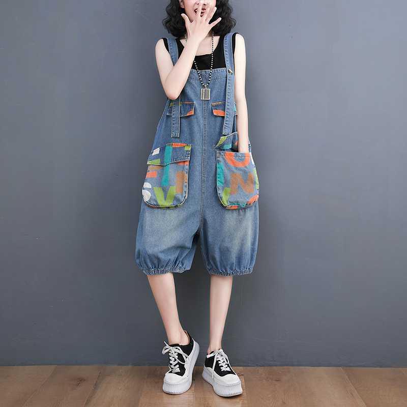 Real shot plus size Denim suspenders for 2024 summer Denim printed loose casual all-match suspenders for women