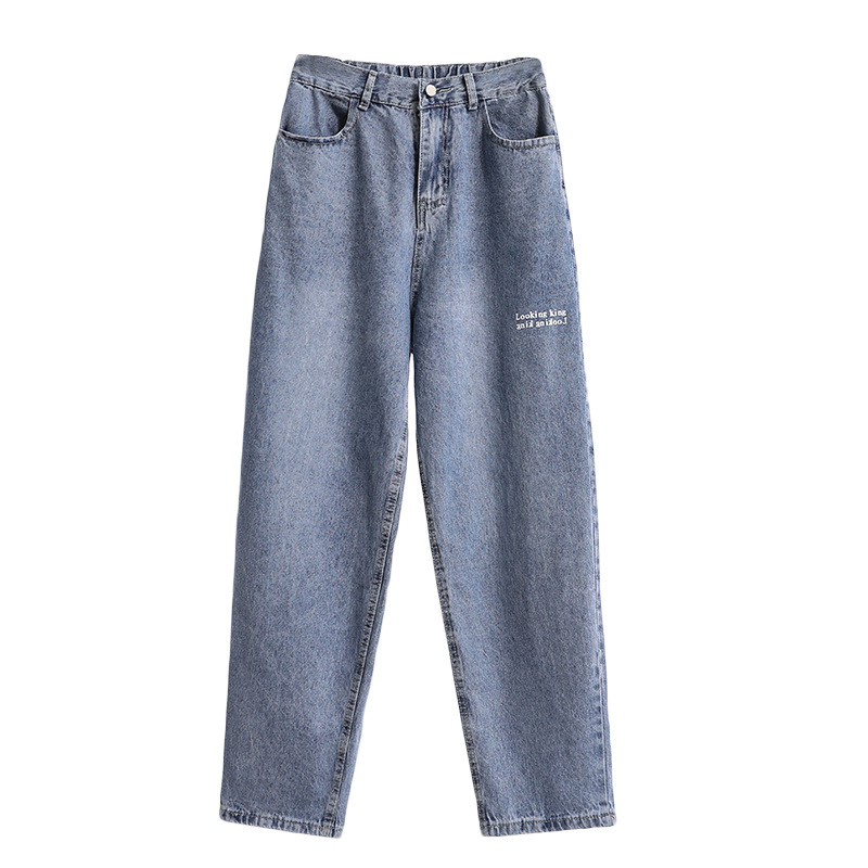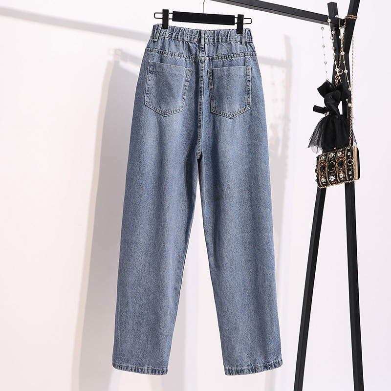 Real shot plus size fat sister South Korea retro Hong Kong style simple letter print distressed straight jeans trousers for women