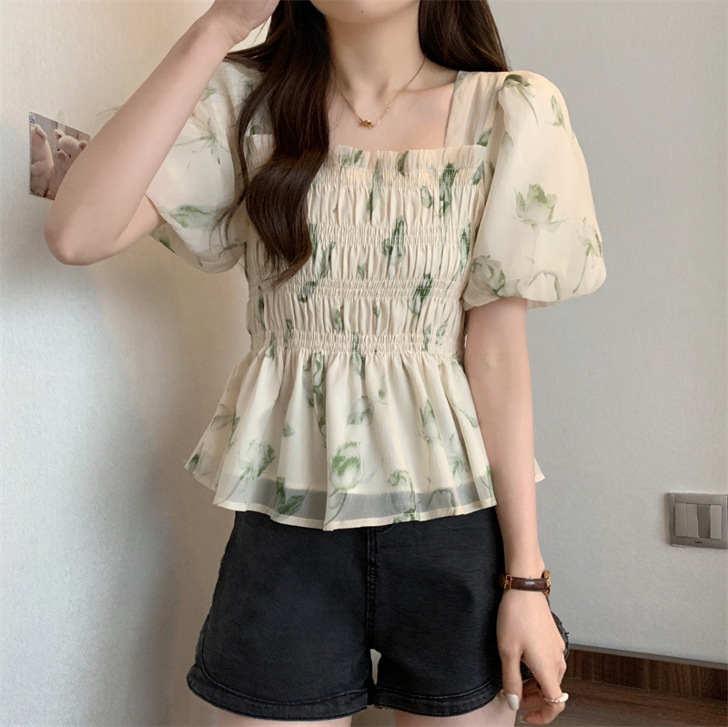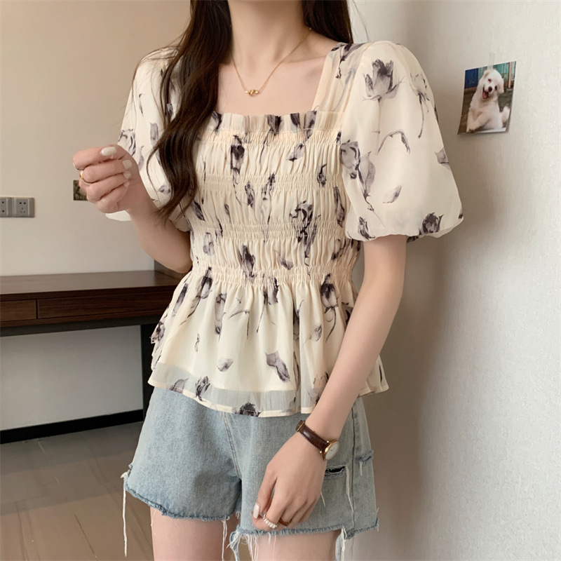 | nameOriginal | Real shot plus size women's clothing 2024 sweet floral chiffon top women's summer square collar bubble sleeve design shirt |