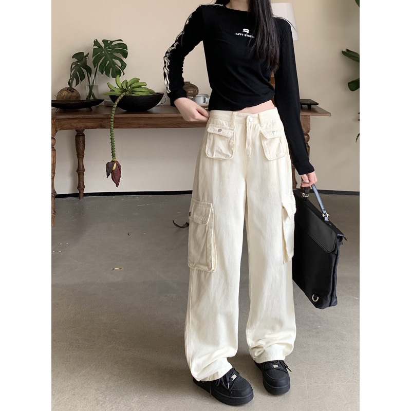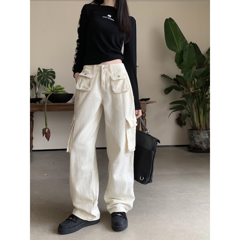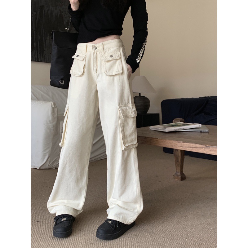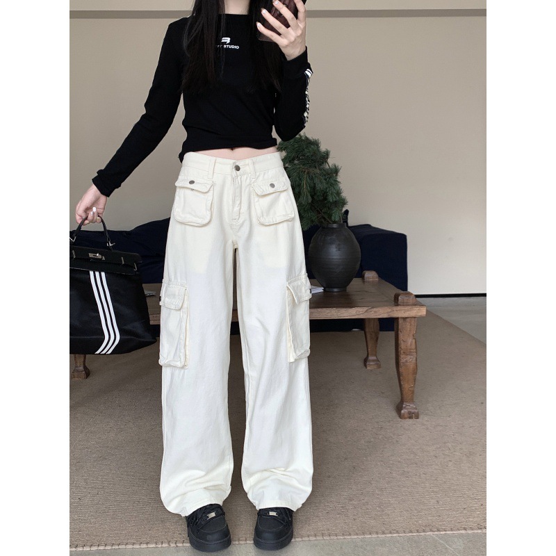 Real shot rice white American high street straight overalls pants pocket loose sports pants women and men high waist slim wide leg pants
