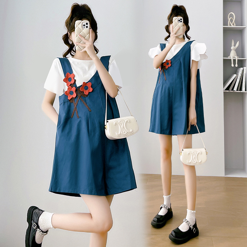 | nameOriginal | Real shot spot 2023 pregnant women summer suit new Korean version of loose bubble sleeve top + strap shorts two-piece set |