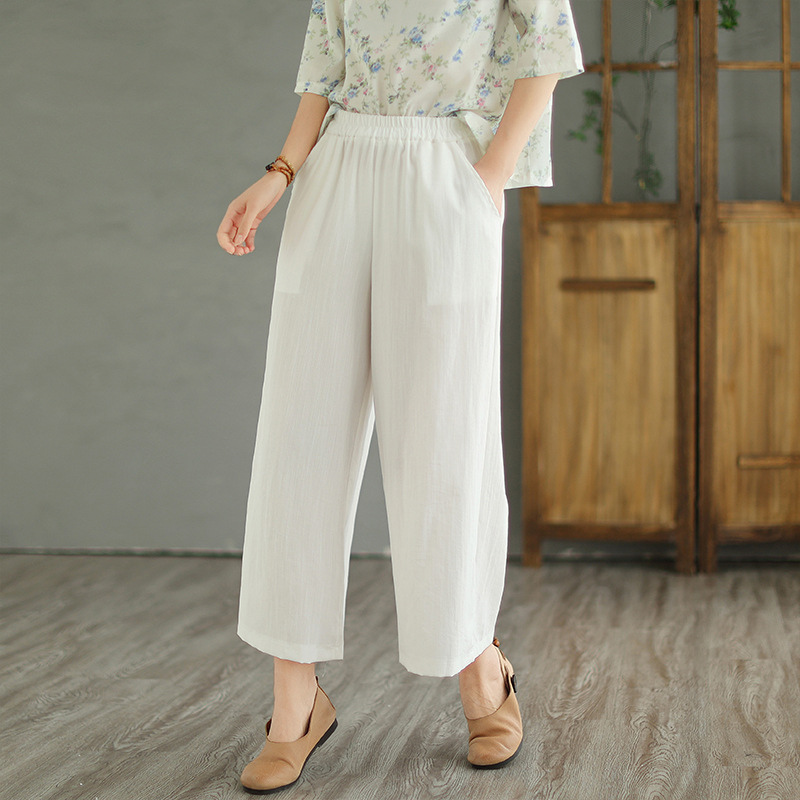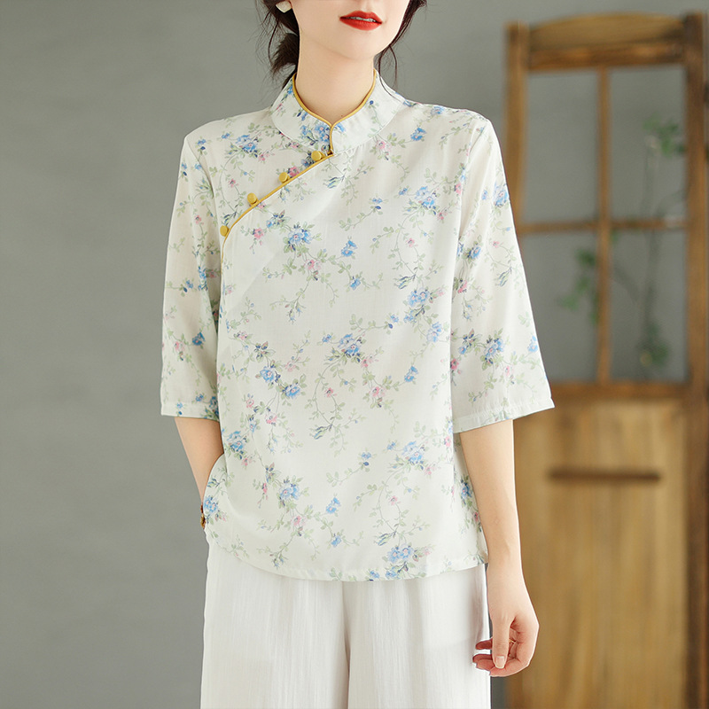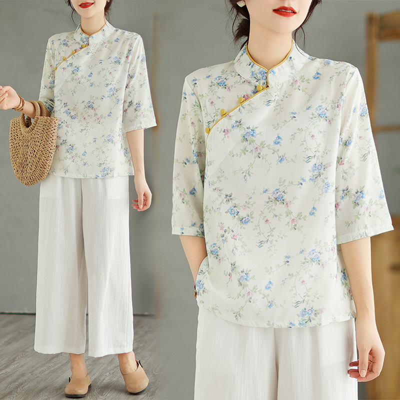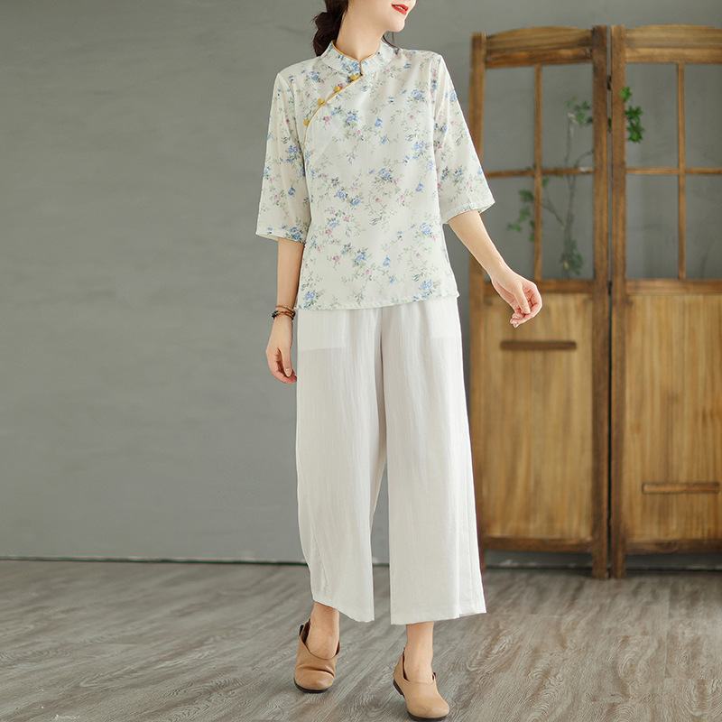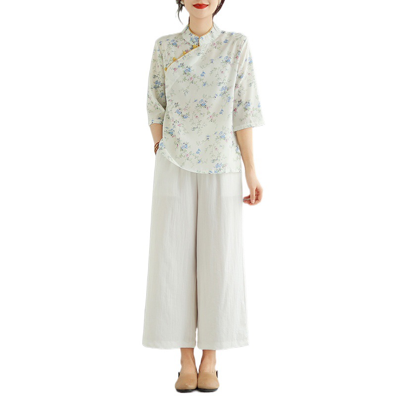 | nameOriginal | Real Shot Spot Cotton and Linen Wide Leg Pants Set Women's Oblique Placket Printed Top Ramie Retro Small Shirt Age-reducing Two-piece Set |