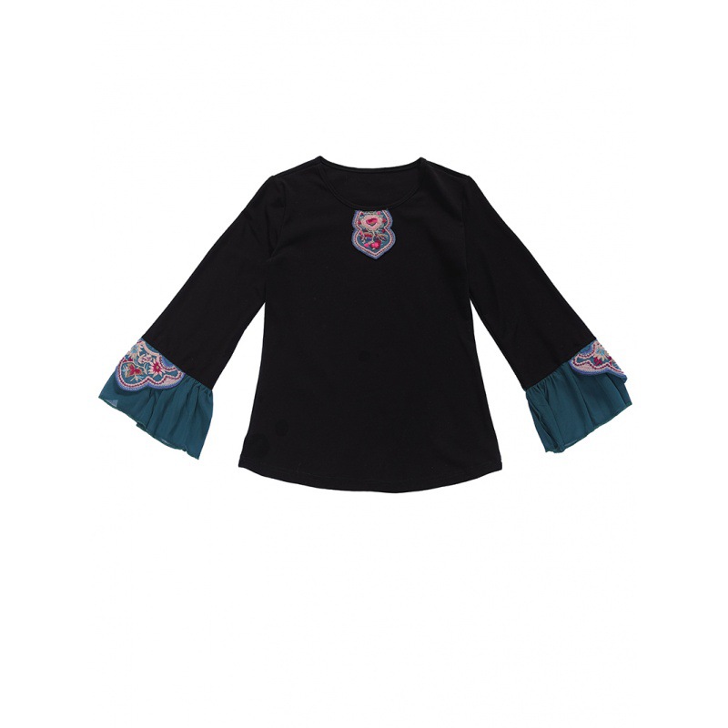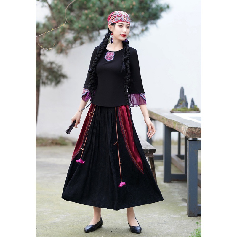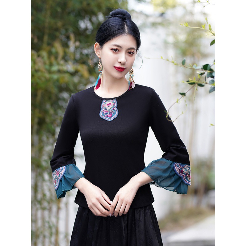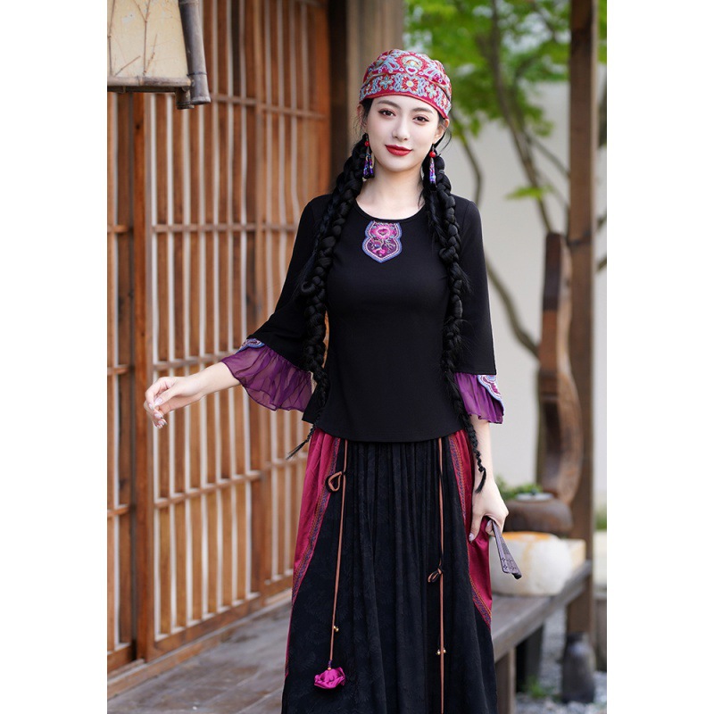 | nameOriginal | Real Shot Spring and Summer New Ethnic Style Embroidered Round Neck Stitching Contrast Color Ruffled Top Mid-Sleeve Pullover T-Shirt |