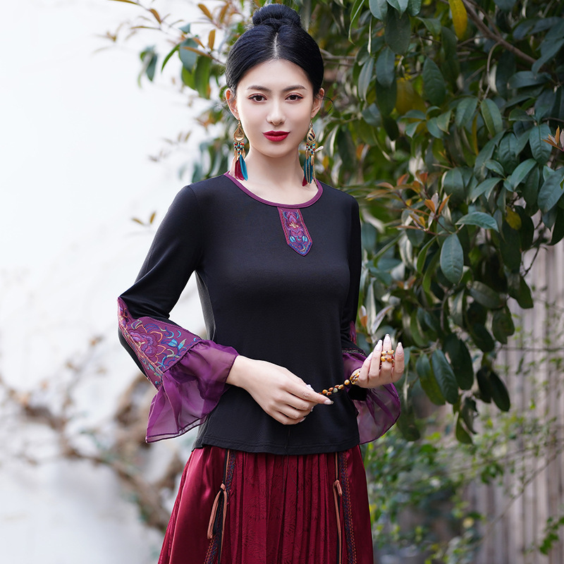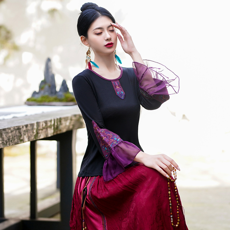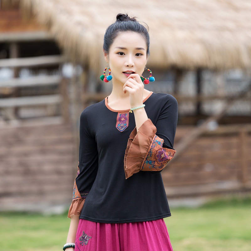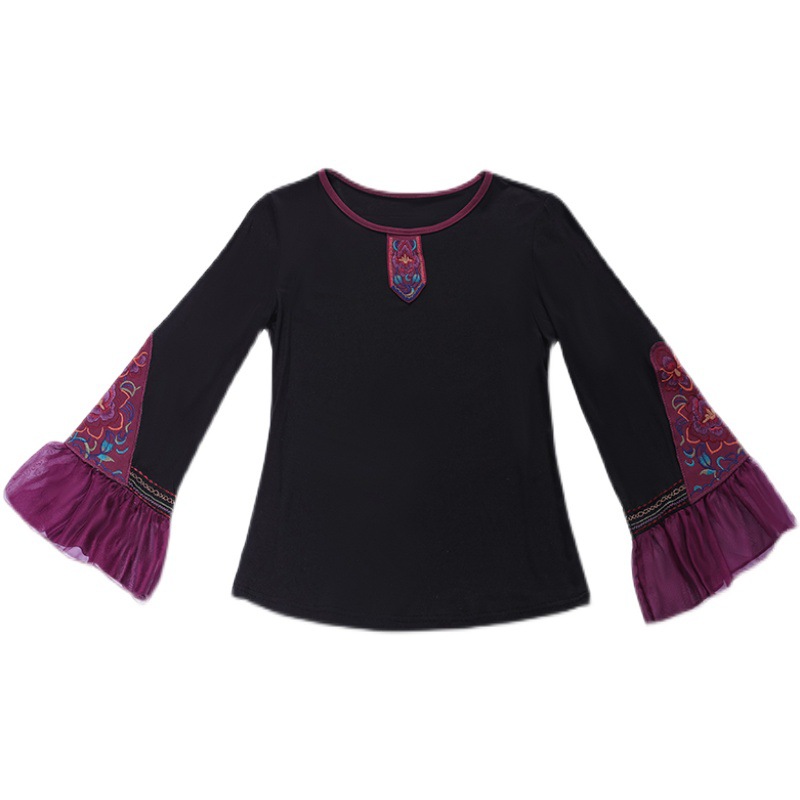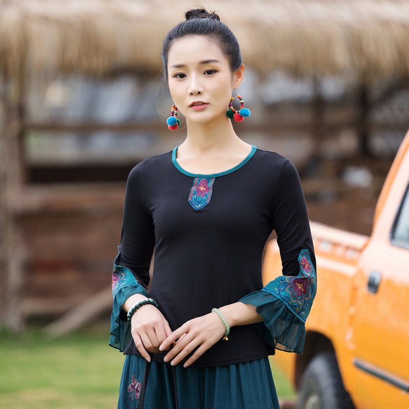 | nameOriginal | Real Shot Spring and Summer New Ethnic Style Embroidered Round Neck Stitching Contrast Color Ruffled Top Mid-Sleeve Pullover T-Shirt |