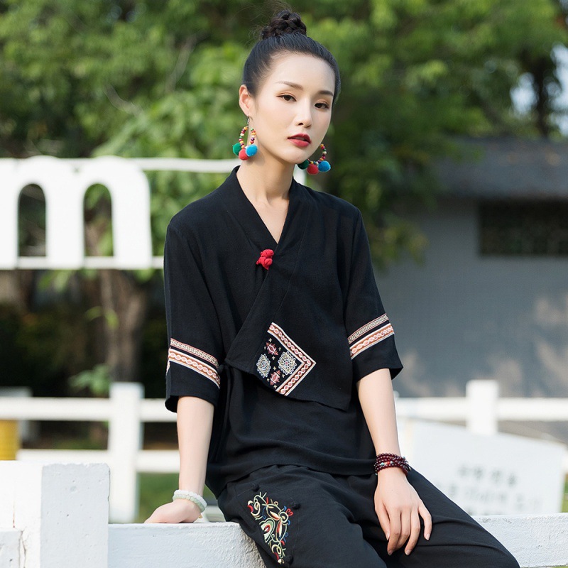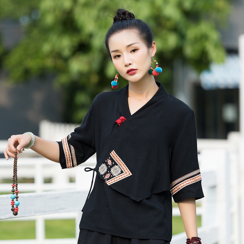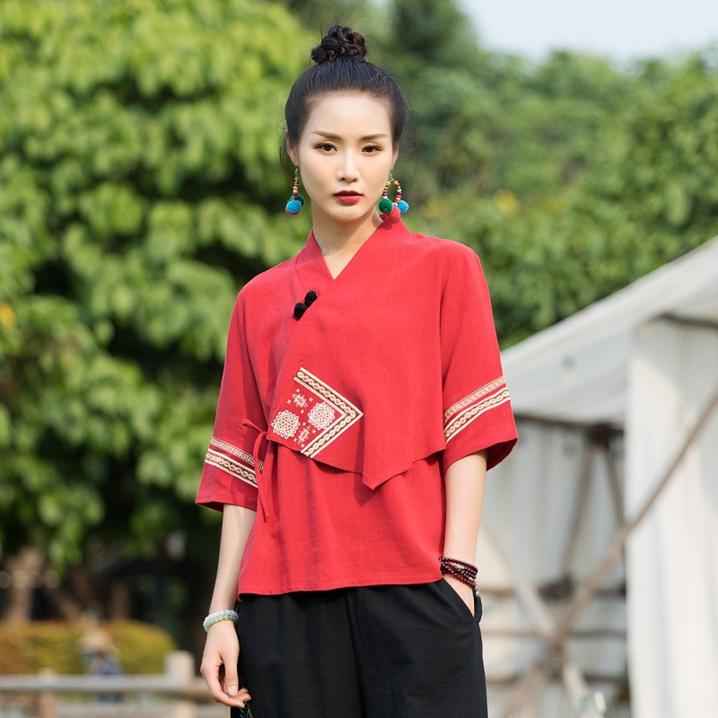 | nameOriginal | Real shot summer artistic vintage embroidered diagonal lace-up tea clothes cotton and linen top Chinese style embroidered T-shirt |