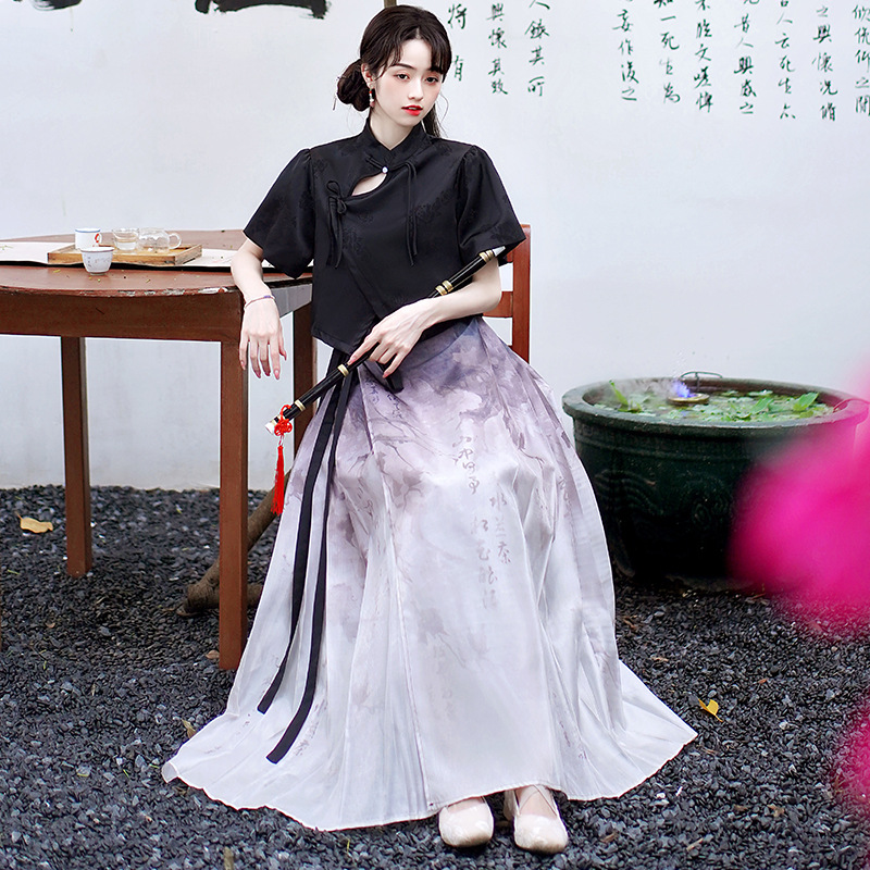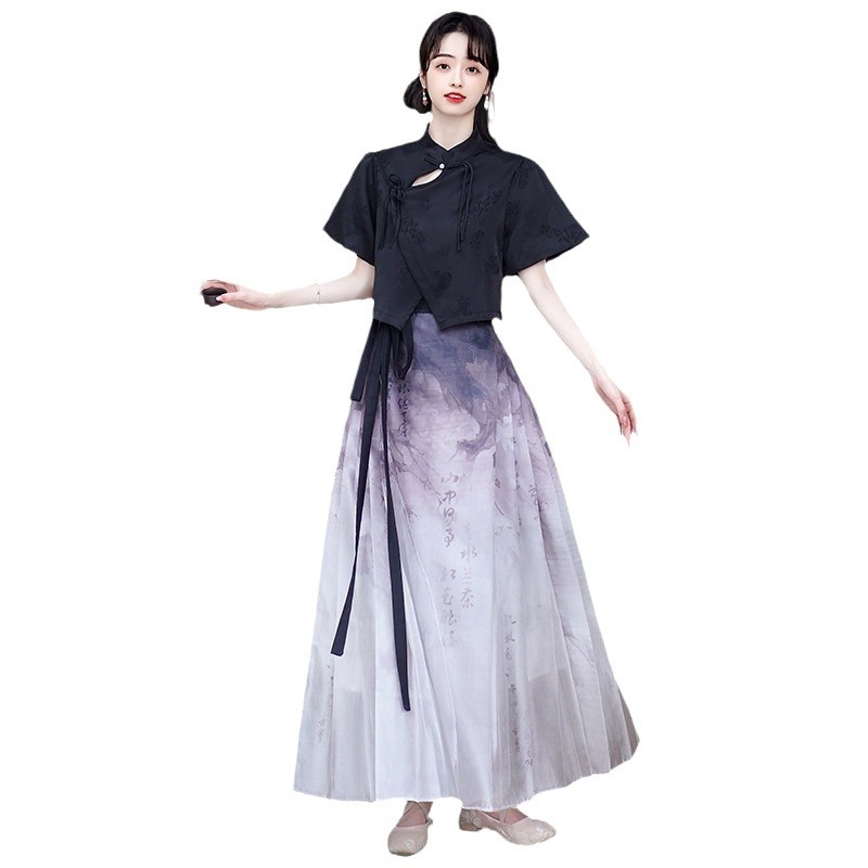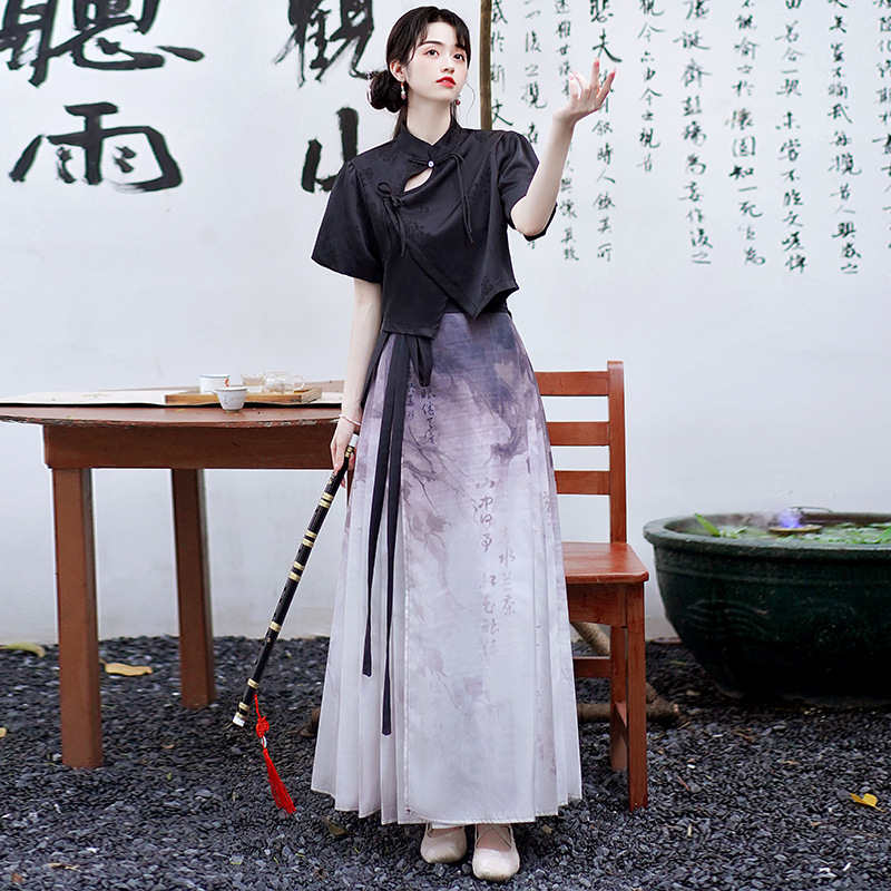 Real Shot Summer New New Chinese Black Jacquard Joker Top Gradient Ink Painting Printing and Dyeing Horse Face Skirt for Work