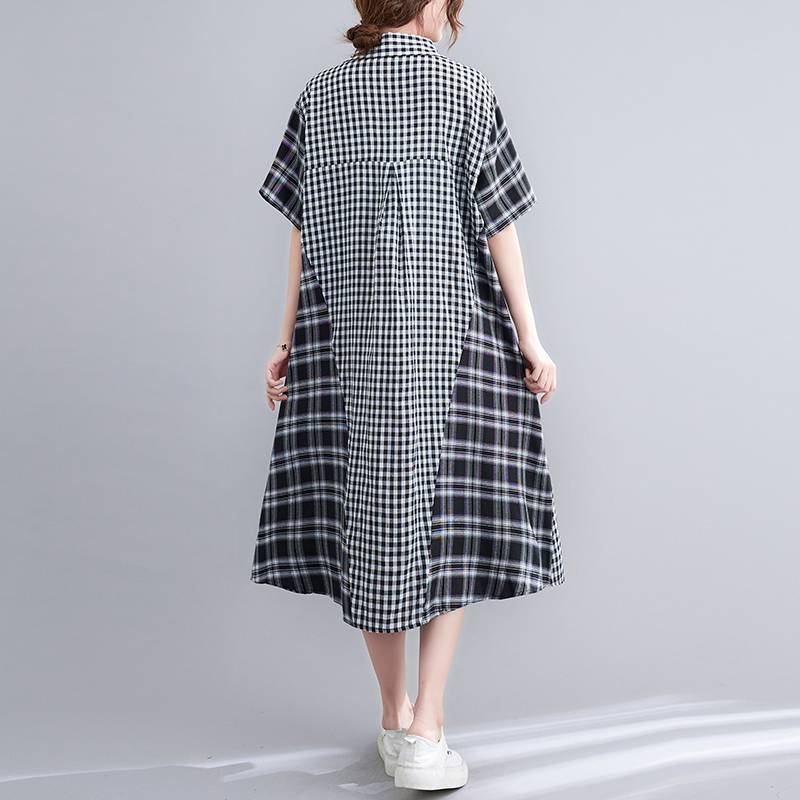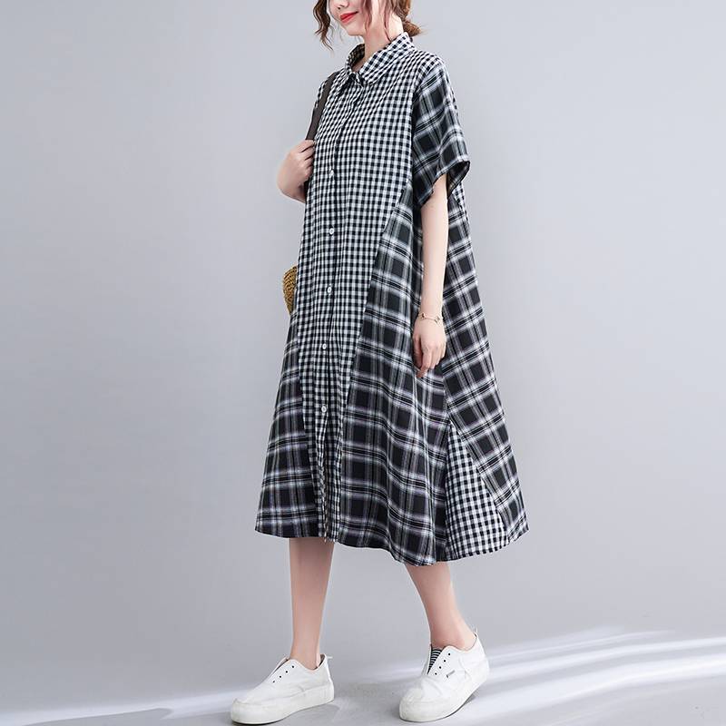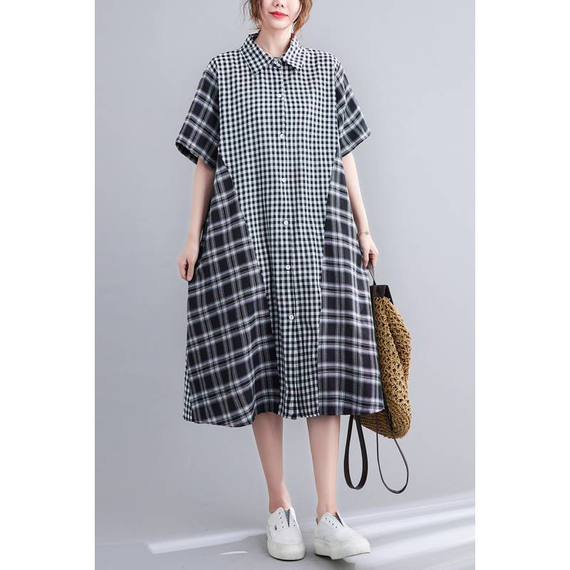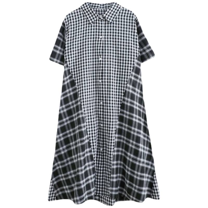 Real shot Summer new style loose plus size fat covering stitching mid-length plaid shirt dress for women