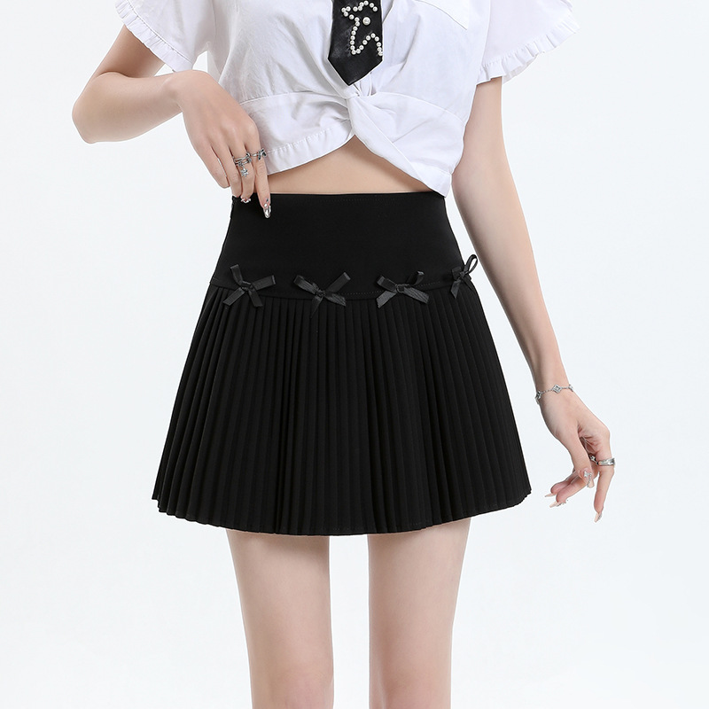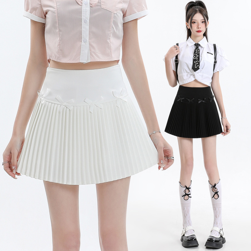 Real Shot White Bow Suit Skirt Women's 2024 Summer High Waist Slimming Anti-glare A- line Pleated Skirt