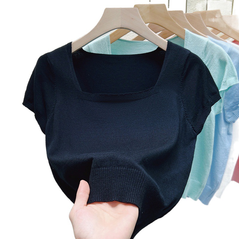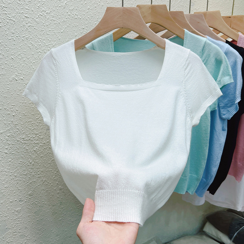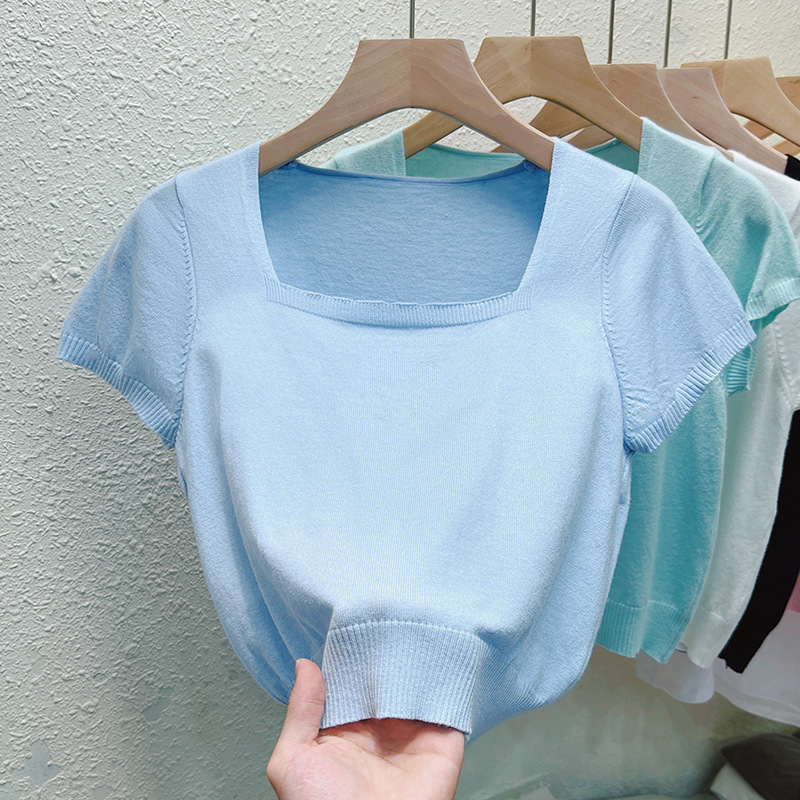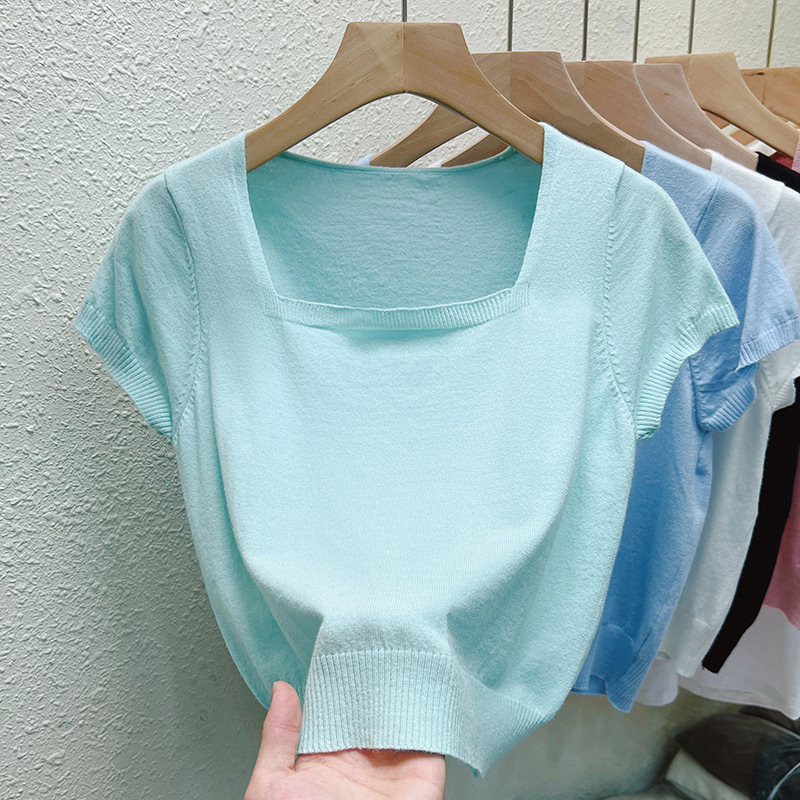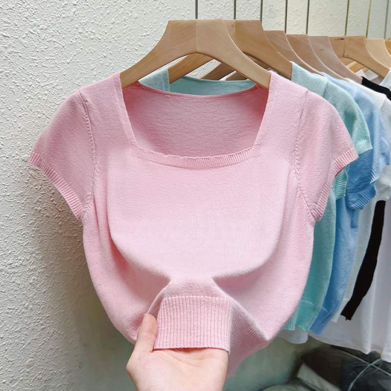 Real Shoulder Square Collar Short Short-sleeved T-shirt Women's 2024 Summer New Korean Style Simple Bottoming Top