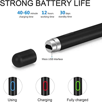 This stylus pen is perfect for taking notes, drawing, and designing on electronic devices. It has been tested on various devices such as iPhones, iPad Pros, smartphones, tablets, and capacitance touch screens, and works exceptionally well. It is an excellent alternative to the Apple Pencil, and it does not require a Bluetooth connection. Simply press the button on top to turn it on, and it’s ready to use. The pen is made of aluminum alloy and has a length of 180mm, a pen tube diameter of 8.9mm, and a fiber tip diameter of 0.24 (6mm). It weighs 16.6 grams and takes 60-80 minutes to charge, providing a working time of 10 hours.