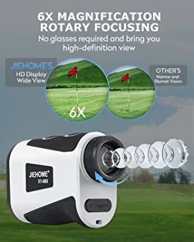 The rangefinder has multi-layer coated optical lenses and an LCD digital and icon display, providing brighter and clearer images. It has a 6X magnification lens and adjustable diopter for precise focus on the display. The device is tournament legal and comes with a 1-year warranty and lifetime technical support from Jiehome. If you have any questions or concerns, their goal is to provide fast and effective service.