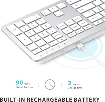 The iClever GK08 Wireless Keyboard and Mouse Combo is a high-quality and durable set that offers an exceptional typing experience. The keyboard has a sleek and thin profile with a brushed silver colorway that adds a touch of elegance to your desk. The scissor-switch key design provides stability, precision, and efficiency, making typing silent and comfortable. The keyboard and mouse are rechargeable, and the keyboard can last up to 90 hours of continuous typing on one charge. The set is compatible with most computers and laptops, including Windows, Mac OS, and Chrome OS systems. The keyboard has full-size keys with convenient media keys, including Mute, play/pause, backward and forward, volume up and down. The set has a 33 feet signal range, allowing you to work remotely. The keyboard has lighted indicators that show the battery status, Fn lock, caps lock, num lock, and charging status. The set is slim, lightweight, and easy to use.